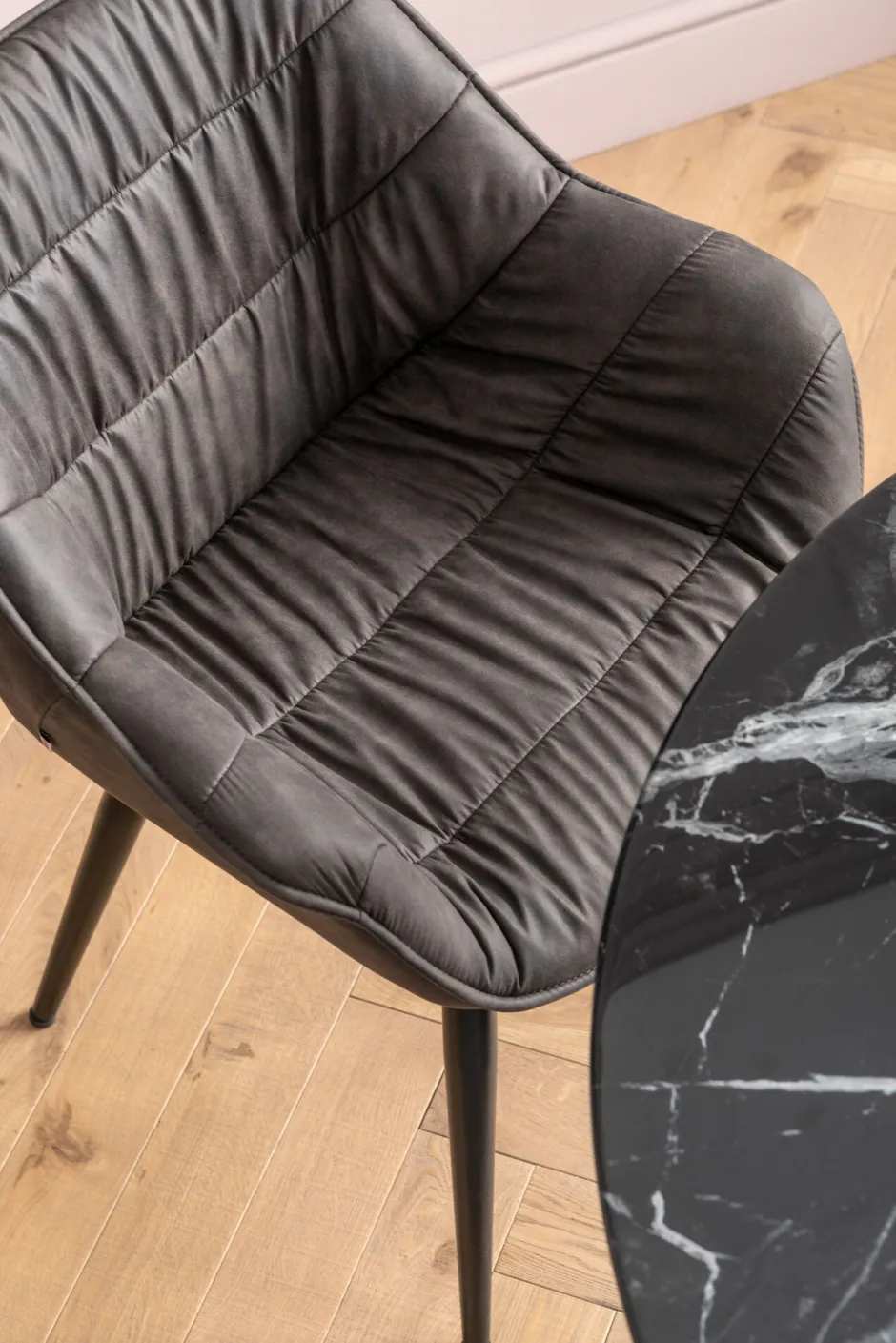 - Steppnähte, ein umlaufender Keder sowie die leicht ausgestellten schwarzen Beine machen Thelma zum Designer Stuhl