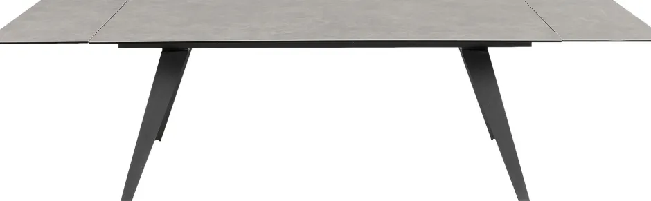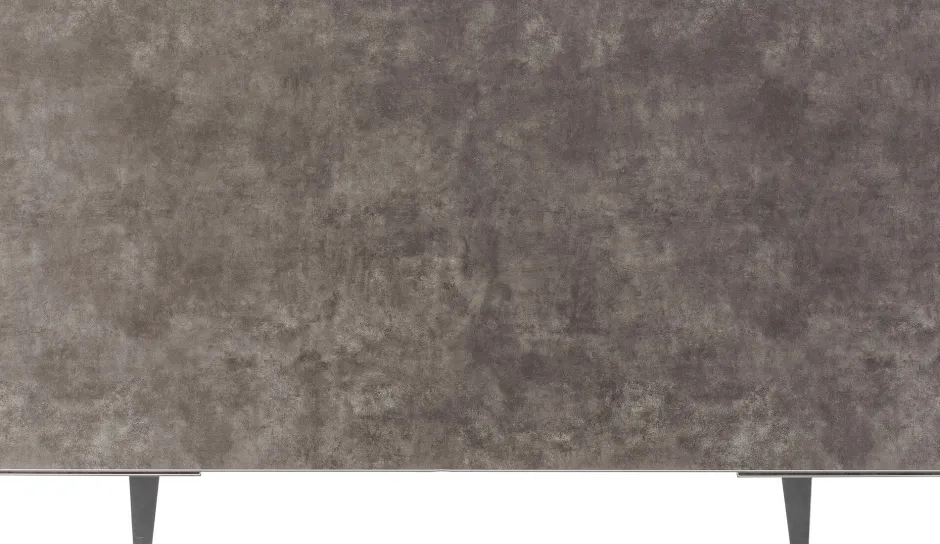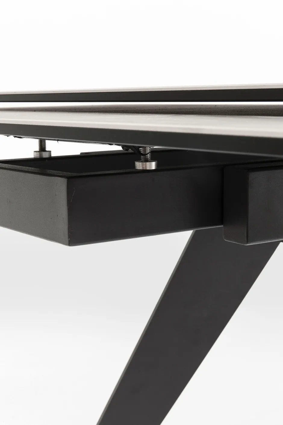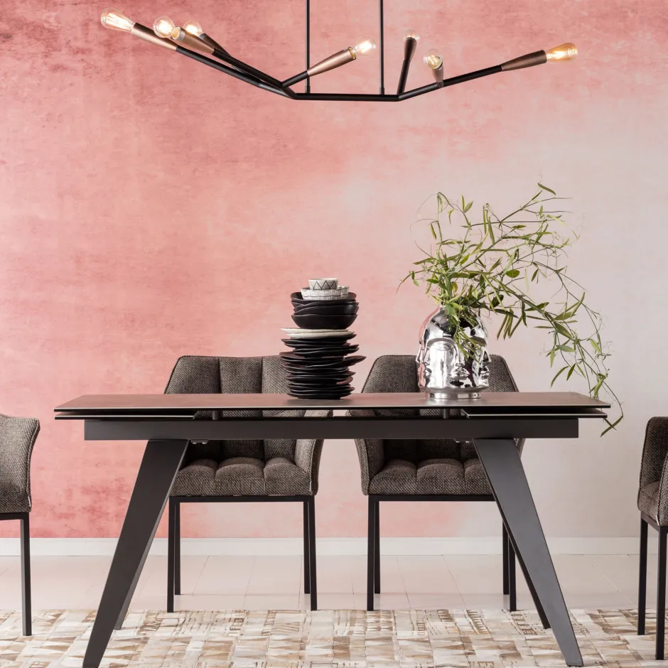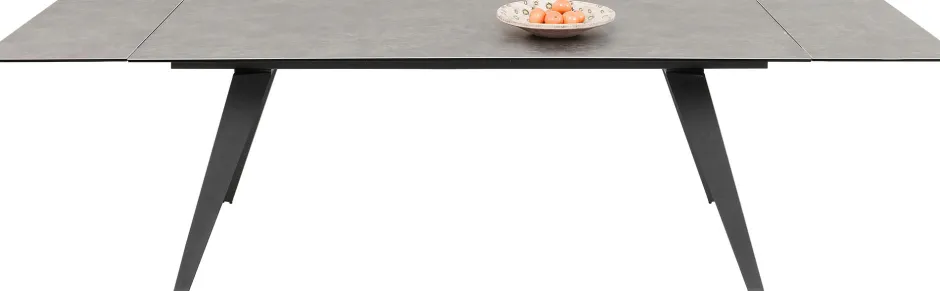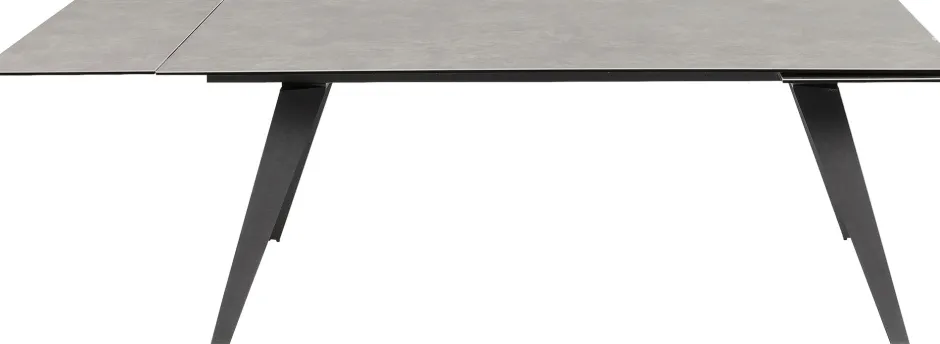- Zeitlos eleganter, rechteckiger Ausziehtisch mit Stahlgestell und einer außergewöhnlichen Glasplatte, die mit Keramik überzogen ist