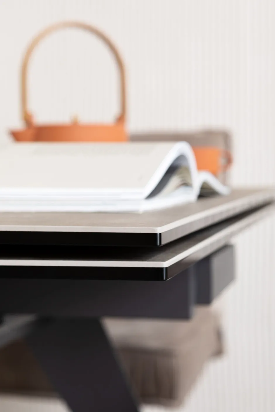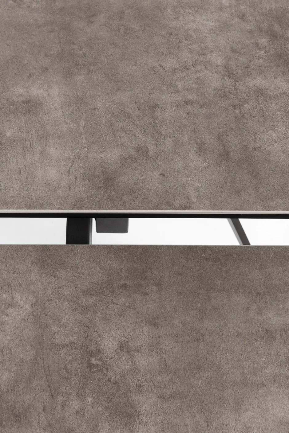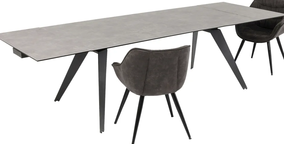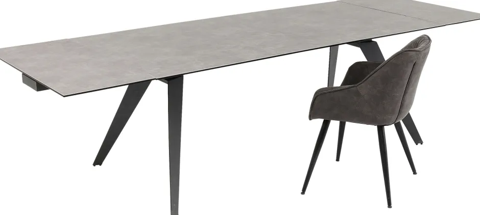 - Zeitlos eleganter, rechteckiger Ausziehtisch mit Stahlgestell und einer außergewöhnlichen Glasplatte, die mit Keramik überzogen ist