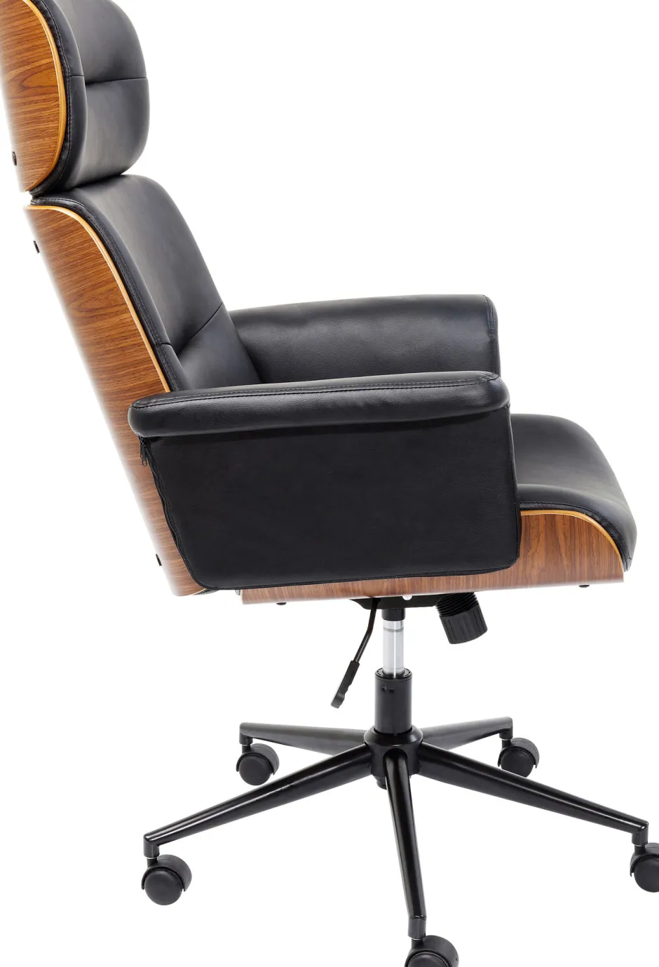 - Ausgesucht schöner Chefsessel: ein Bürodrehstuhl mit edler Furnierholzschale und bequemer Polsterung in schwarzer Lederoptik