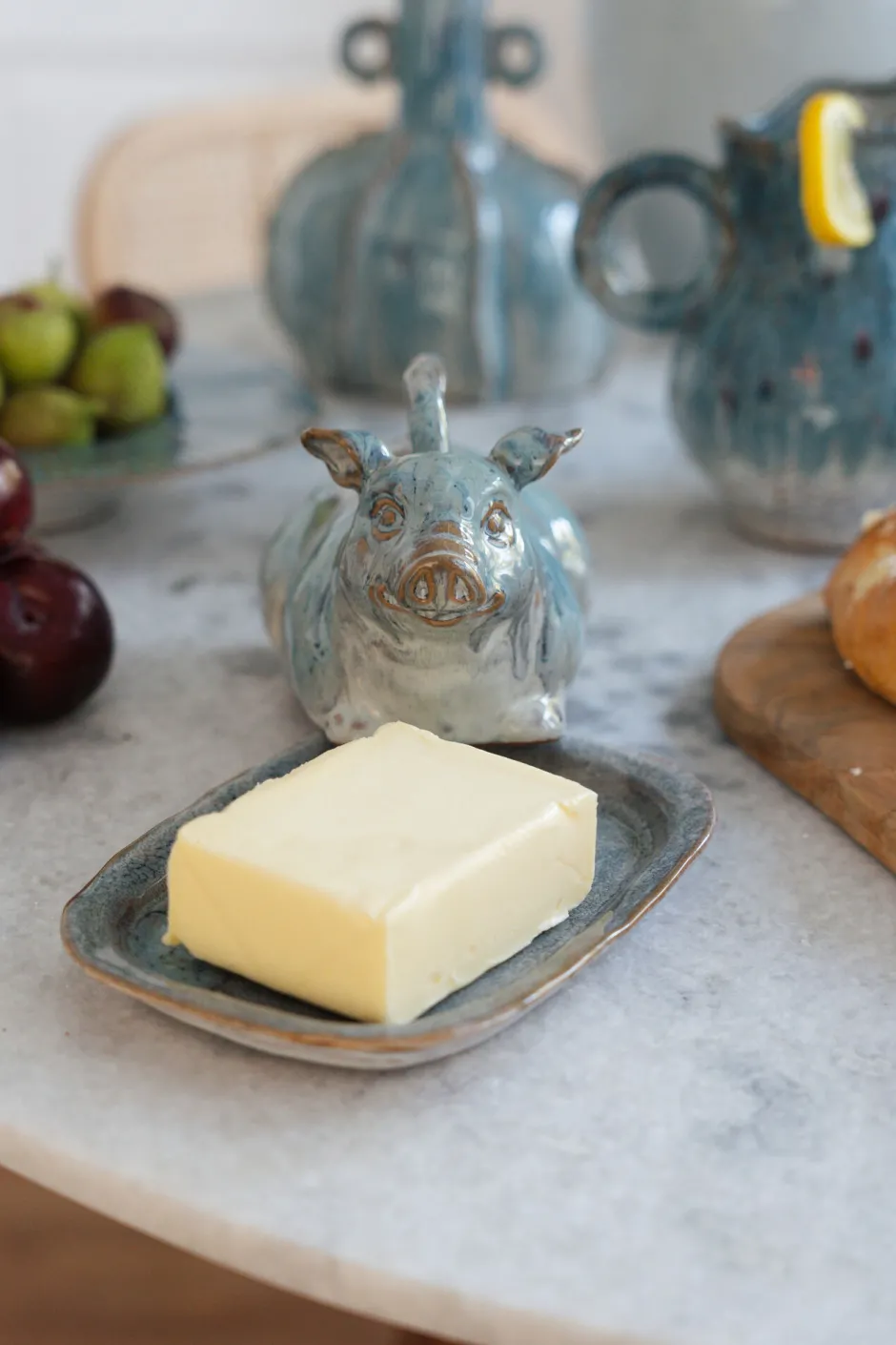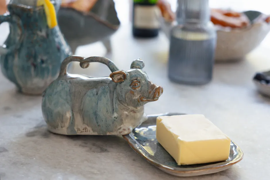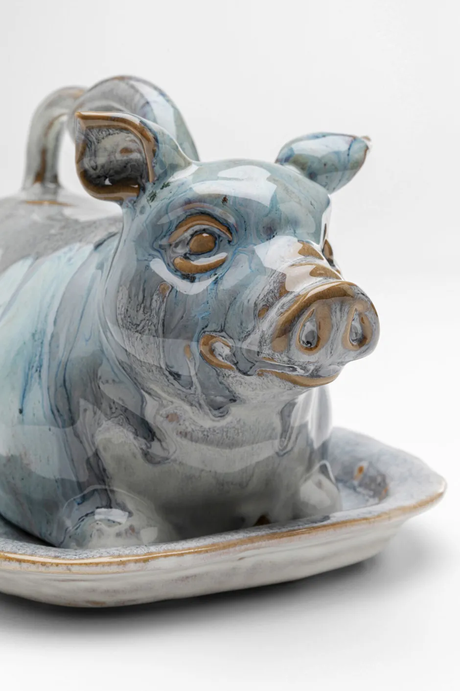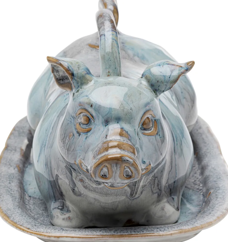 - Diese charmante Butterdose in Schweinchen-Form besticht durch fließende Aquarell-Muster in satten Blau-Nuancen glänzendes Finish