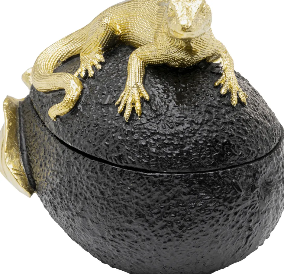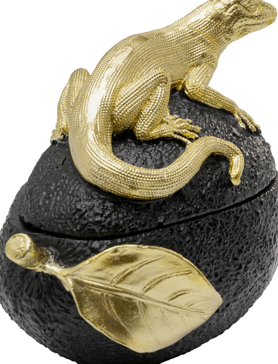 - Eine detailreich gearbeitete Eidechse in Gold sitzt charmant auf der Dose und dient als Griff