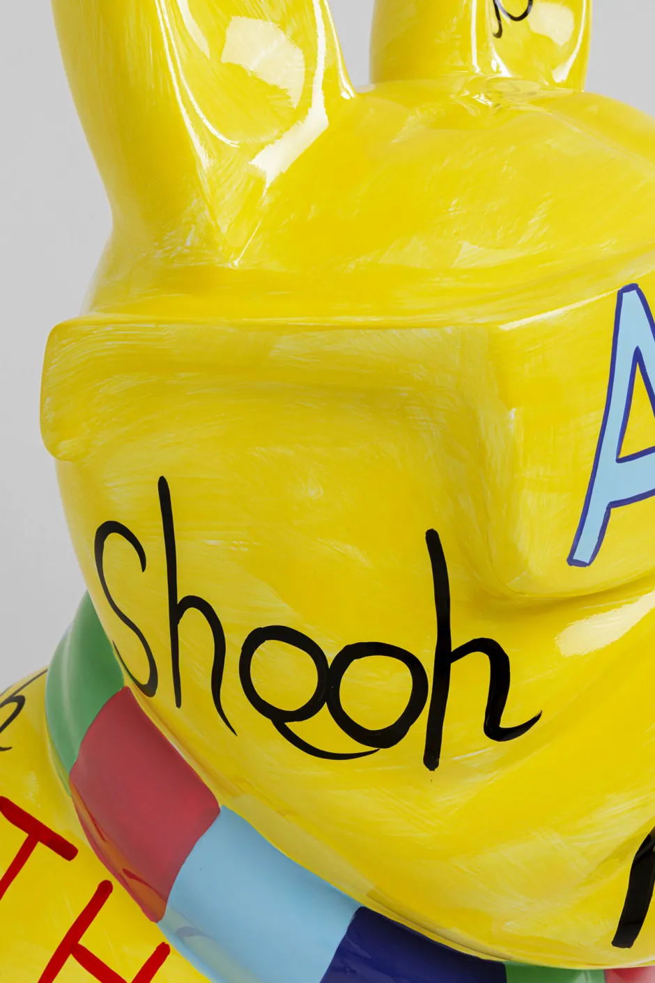 - Die imposante Dekofigur im Graffiti-Stil setzt mit knalligem Gelb und bunten Details ein kraftvolles Statement