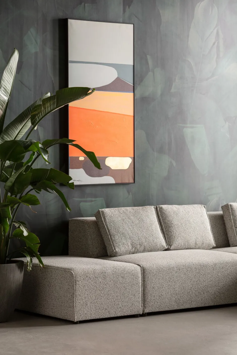 - Dieses große Sofa begeistert mit sanften, klaren Formen und seinem melierten Muster in warmen Beige- und Braun-Tönen