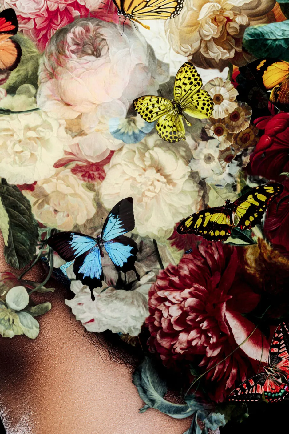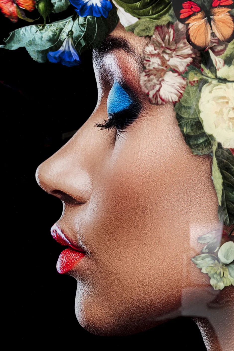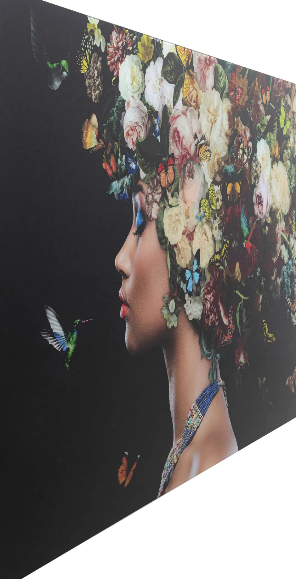 - Großes Glasbild mit Blüten, Schmetterlingen, Vögeln und Portrait