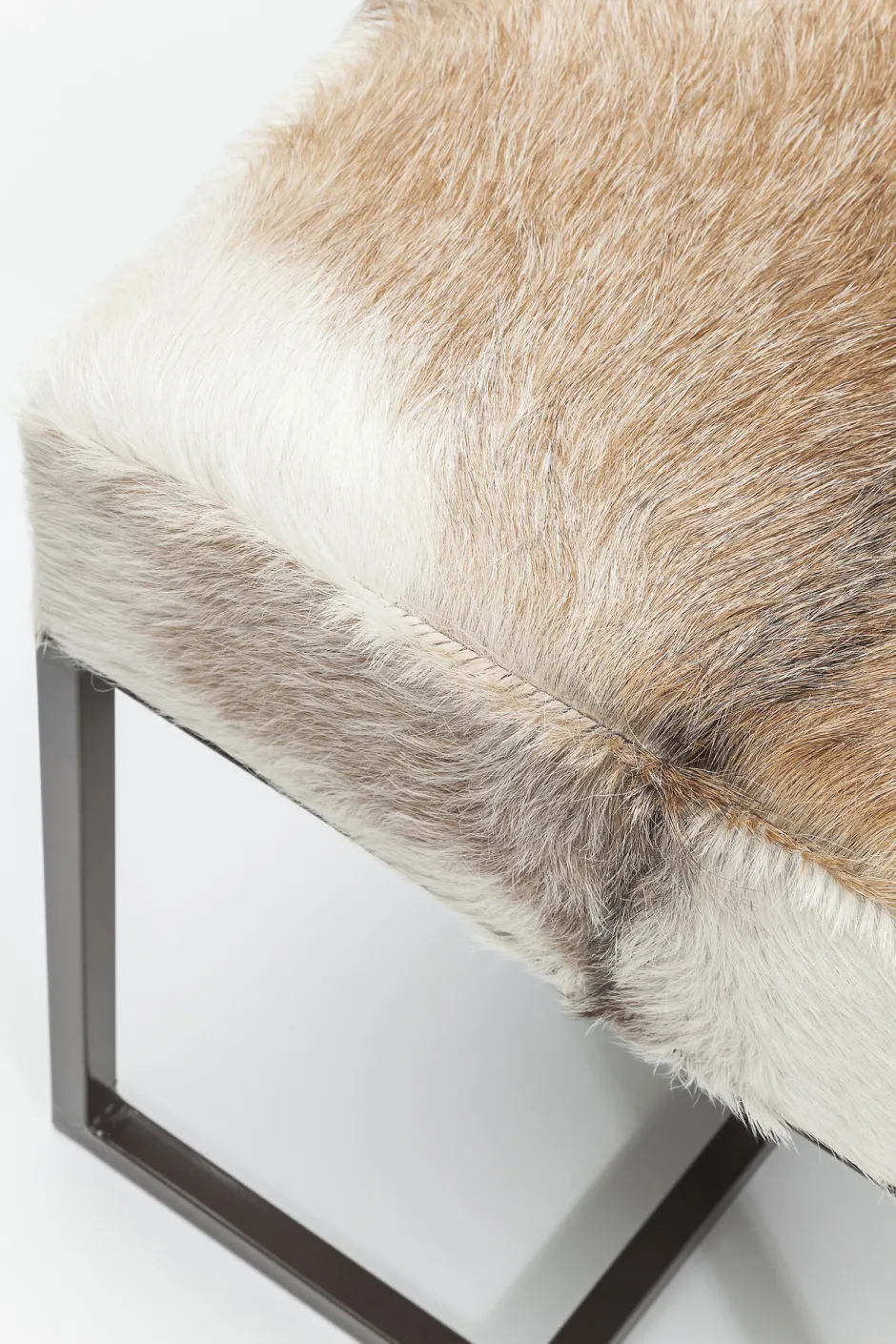 - Quadratischer Polster-Hocker mit dunkelbraunem Stahlgestell und einem Bezug aus echtem Ziegenfell – jeder Sitzhocker ist ein Unikat