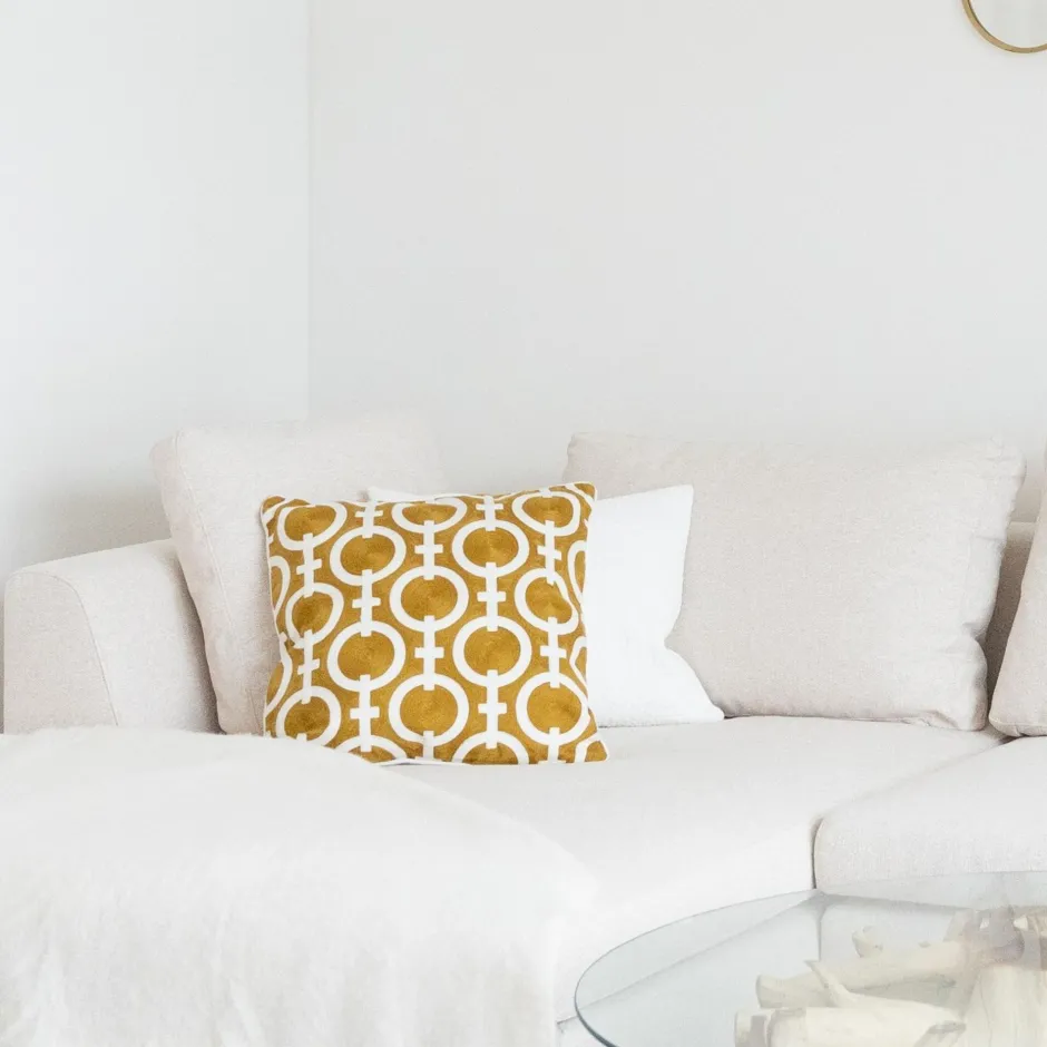 - Quadratisches Sofa-Kissen mit grafischem Muster in Weiß und Gelb mit den Maßen 50×50 Zentimeter