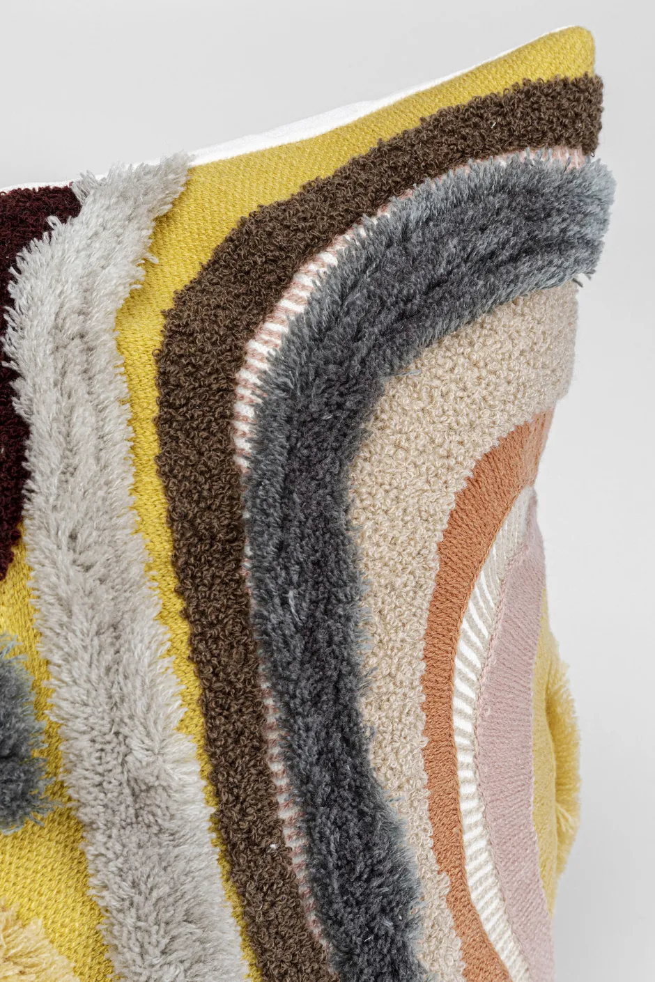 - Poppiger, lebendiger Mix aus flauschigen Oberflächen in unterschiedlichen Webarten in Grau und Gelb