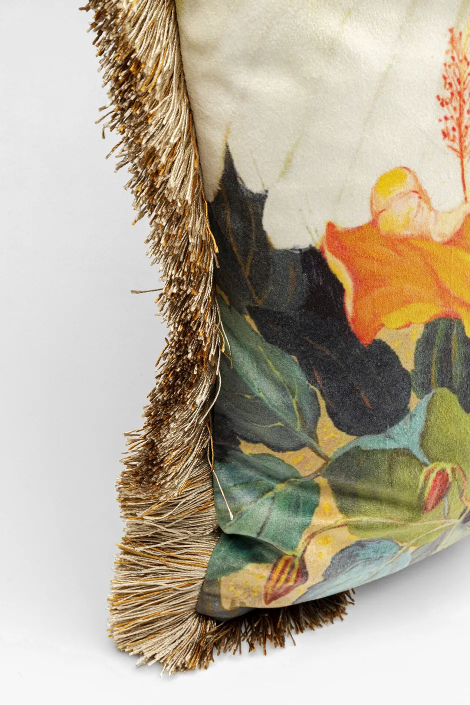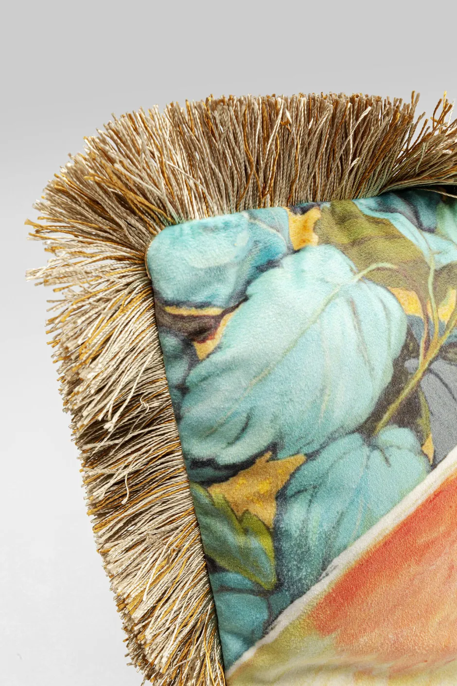 - Hibiskusblüten, exotische Blätter und rosa Kakadus, gerahmt von einer kapriziösen Fransenkante, bringen exotische Vibes aufs Sofa
