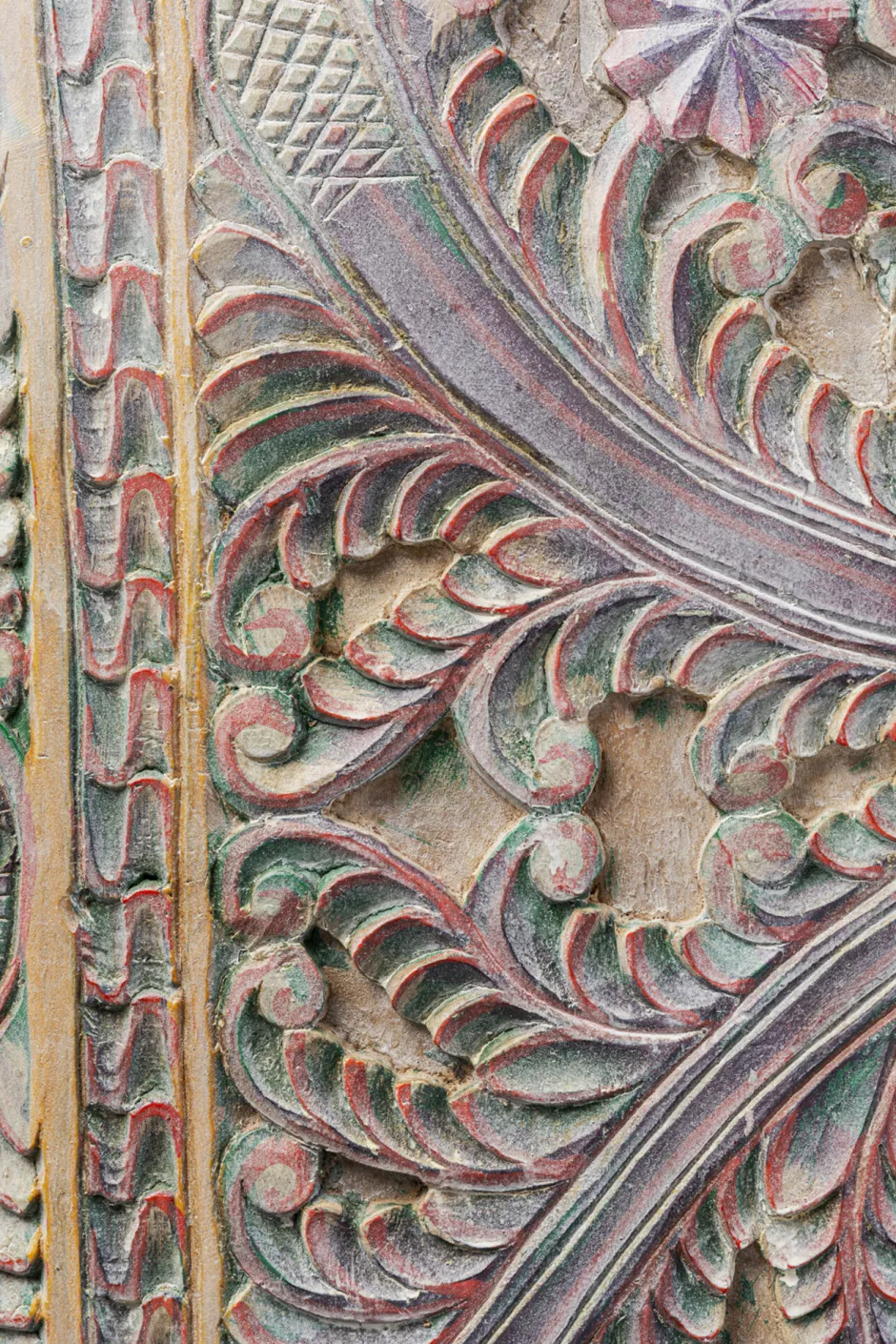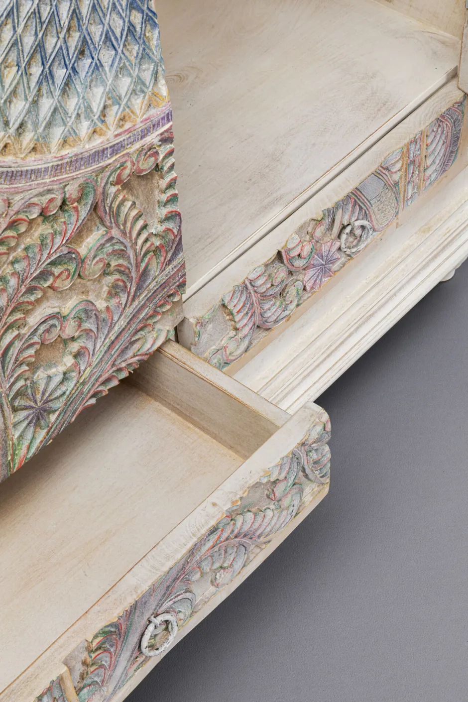 - Aufwändig geschnitzte Fronten in Pastellfarben wie Blau, Rosa und Lila