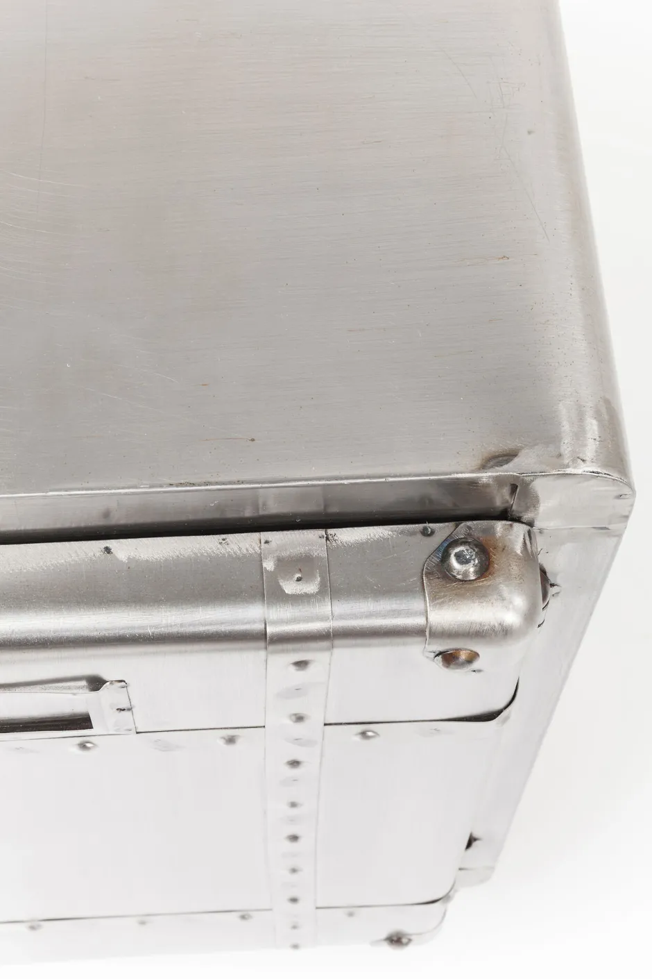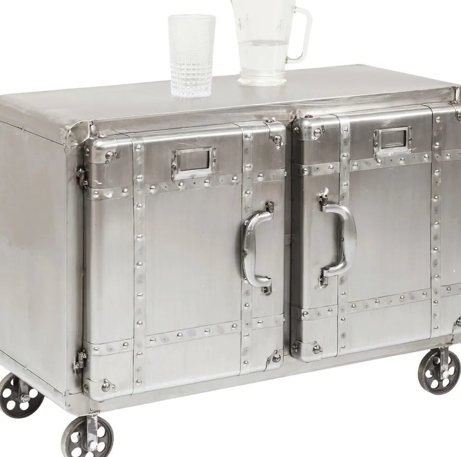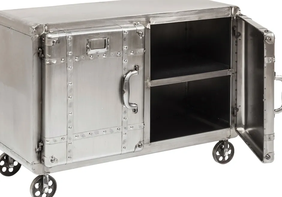 - Rechteckige, kompakte Kommode aus Stahl im Vintage-Look auf vier Rollen mit Schweißnähten und zwei großen Ablageflächen hinter den beiden Türen