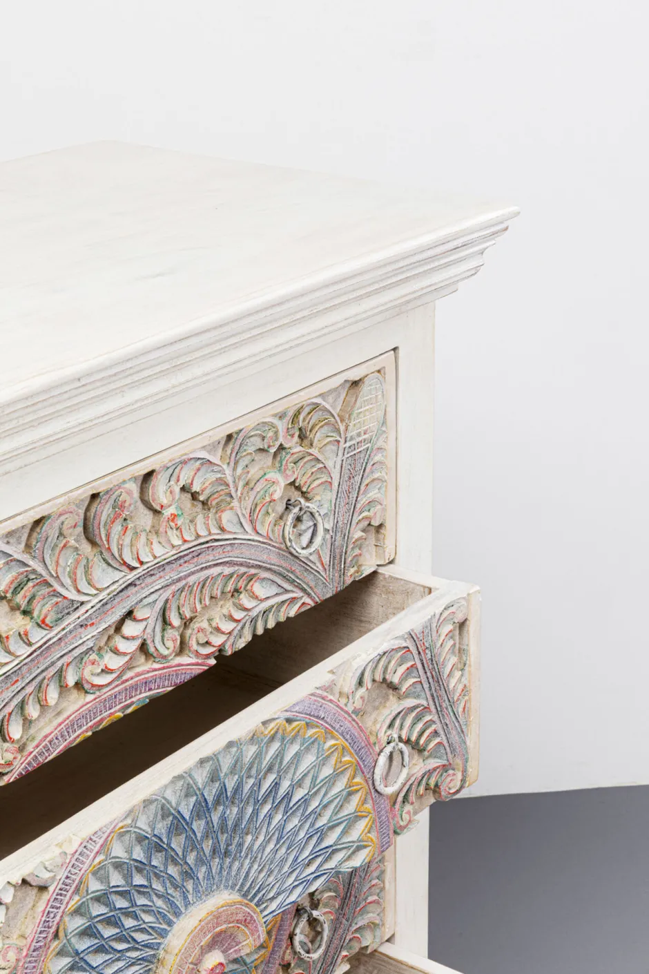 - Aufwändig geschnitzte Fronten in Pastellfarben wie Blau, Rosa und Lila