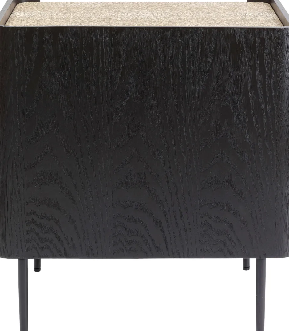 - Charaktervoll: die Verbindung von schwarz-braunem Eichenholz in massiv und furniert mit den cremefarbenen Bezügen in extravaganter Rochenhaut-Optik