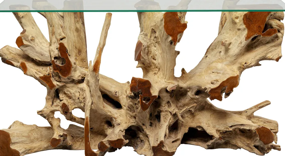 - Das Wurzelgestell und die Glasplatte als konträre Kombi machen den Konsolentisch zum Showpiece im Flur oder Wohnzimmer