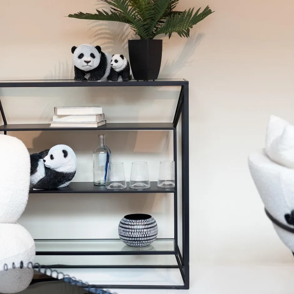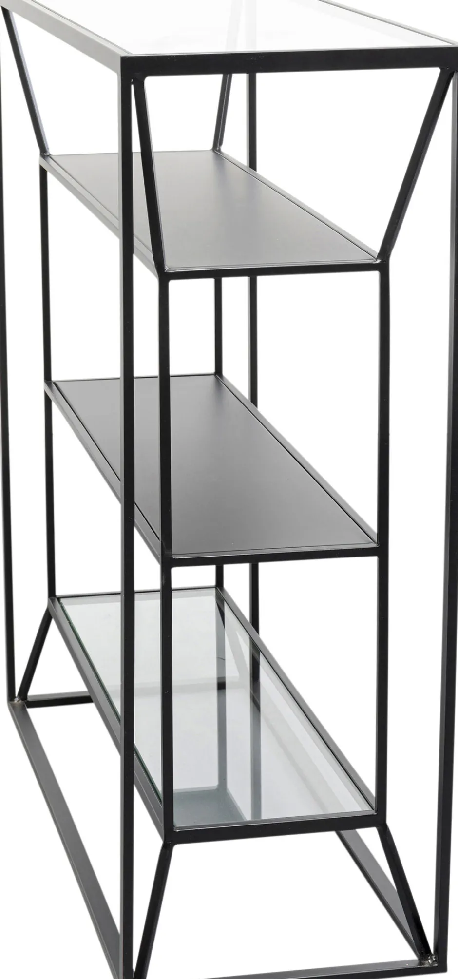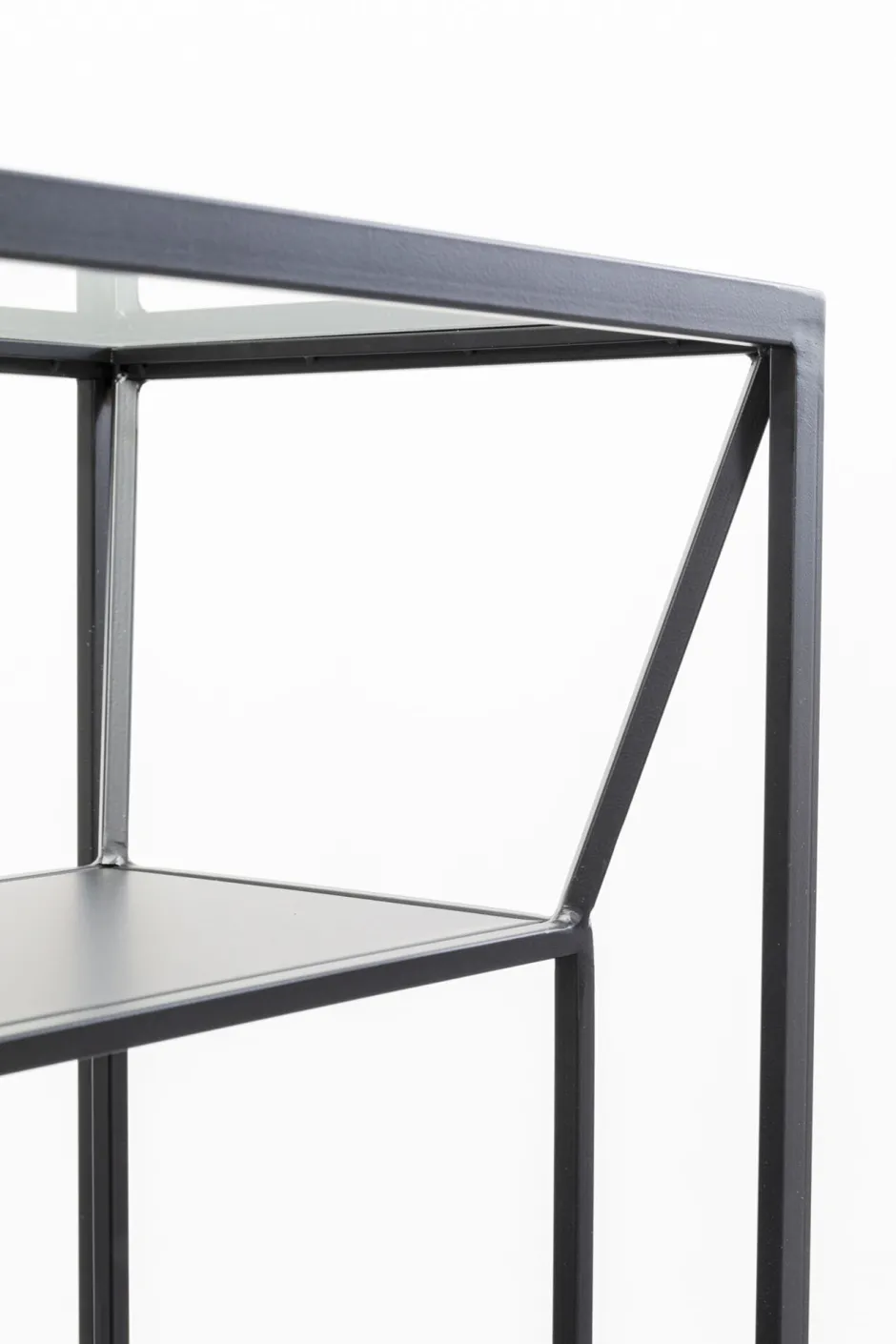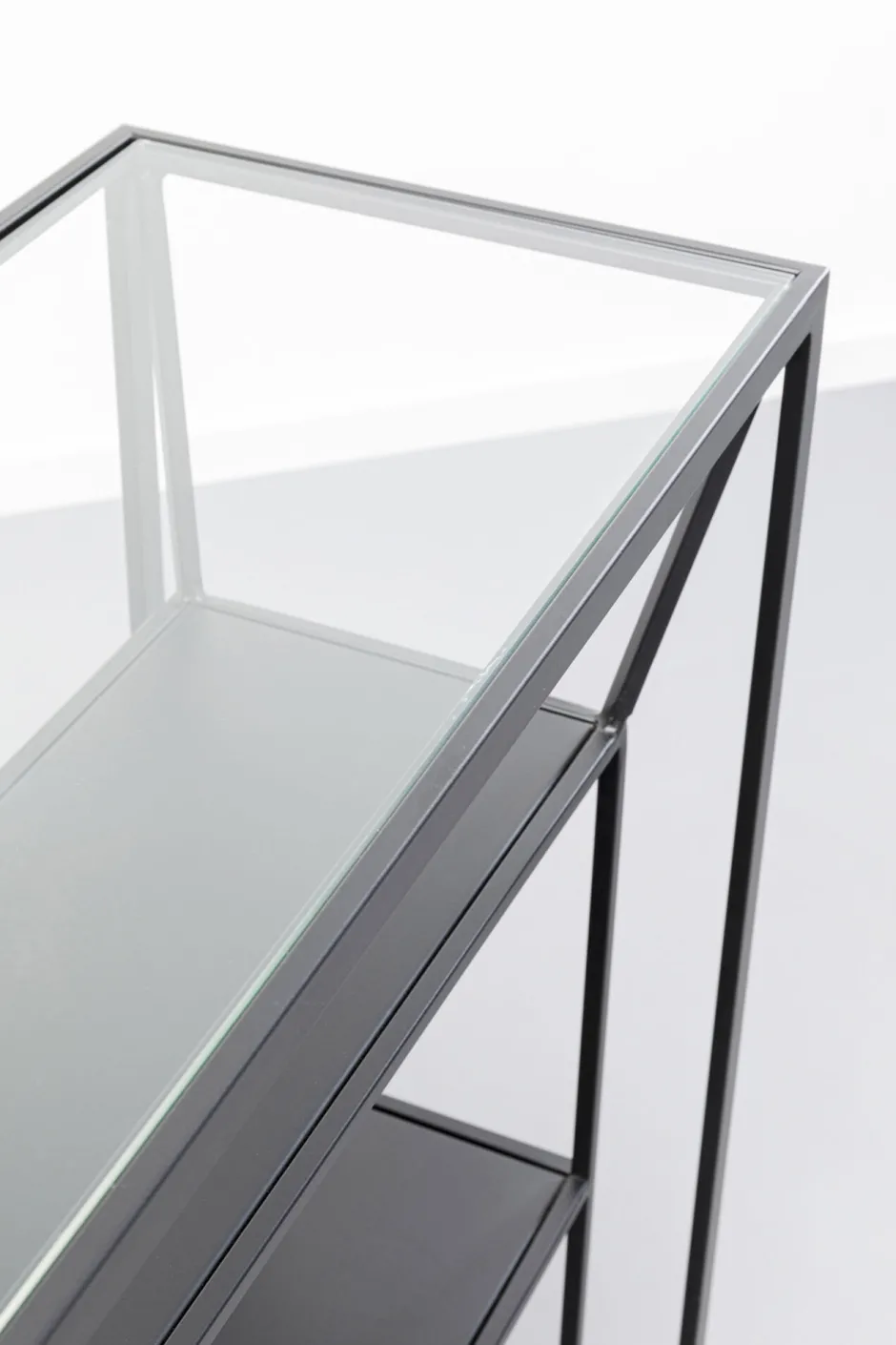 - Das niedrige Metallregal übernimmt auch die Funktion einer Konsole