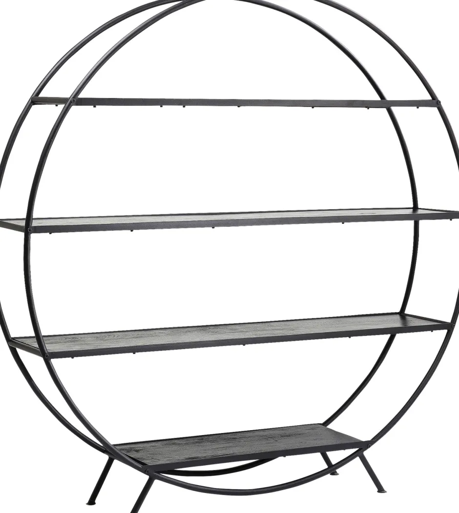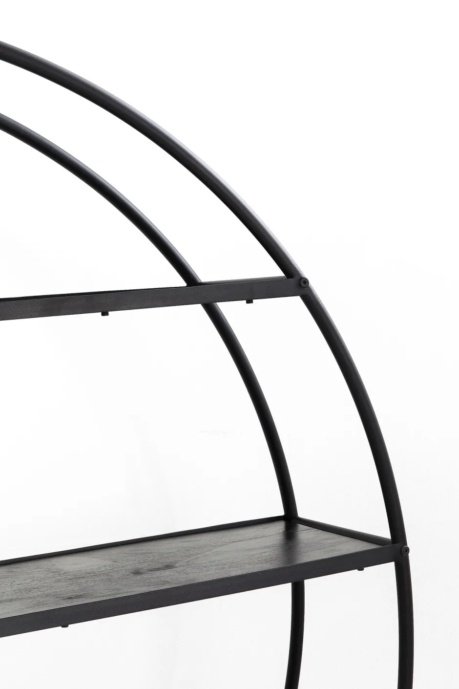- Großes, rundes Regal aus schwarz lackiertem Stahl mit Regalböden aus Massivholz