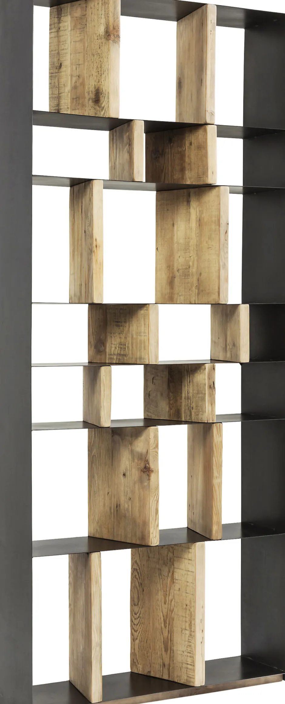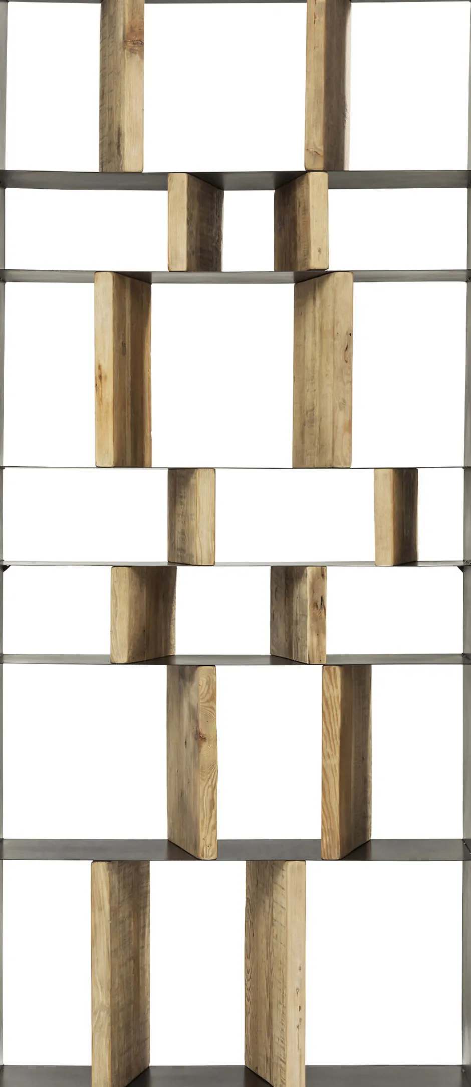 - Hohes Standregal mit einem Korpus und sechs Böden aus schwarz lackiertem Stahl und Elementen aus Kiefern-Massivholz