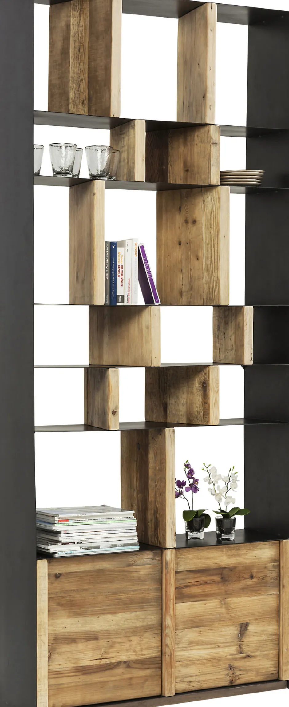 - Die moderne Linienführung und der Mix aus Stahl und Holz machen das Dekoregal einzigartig