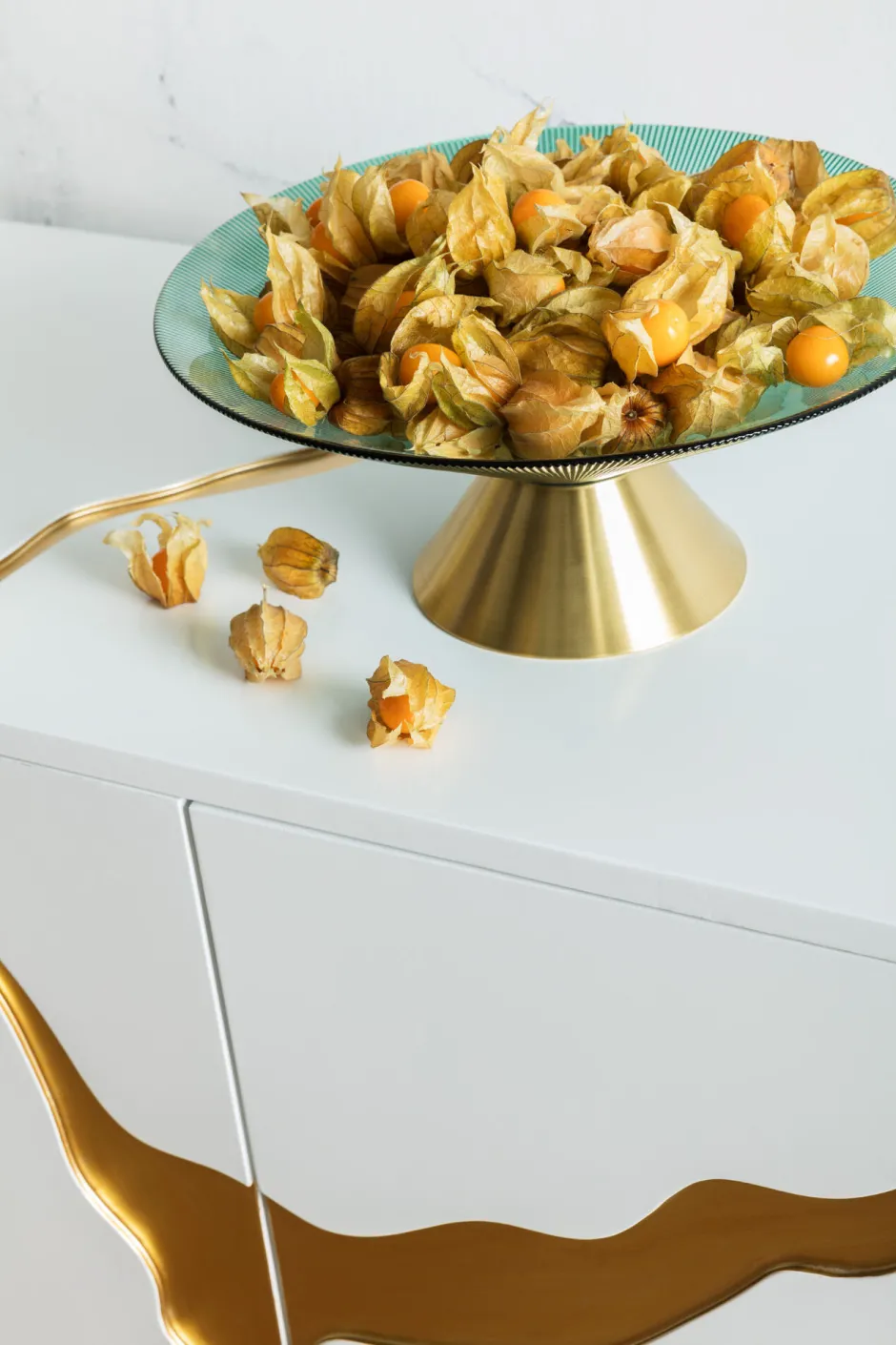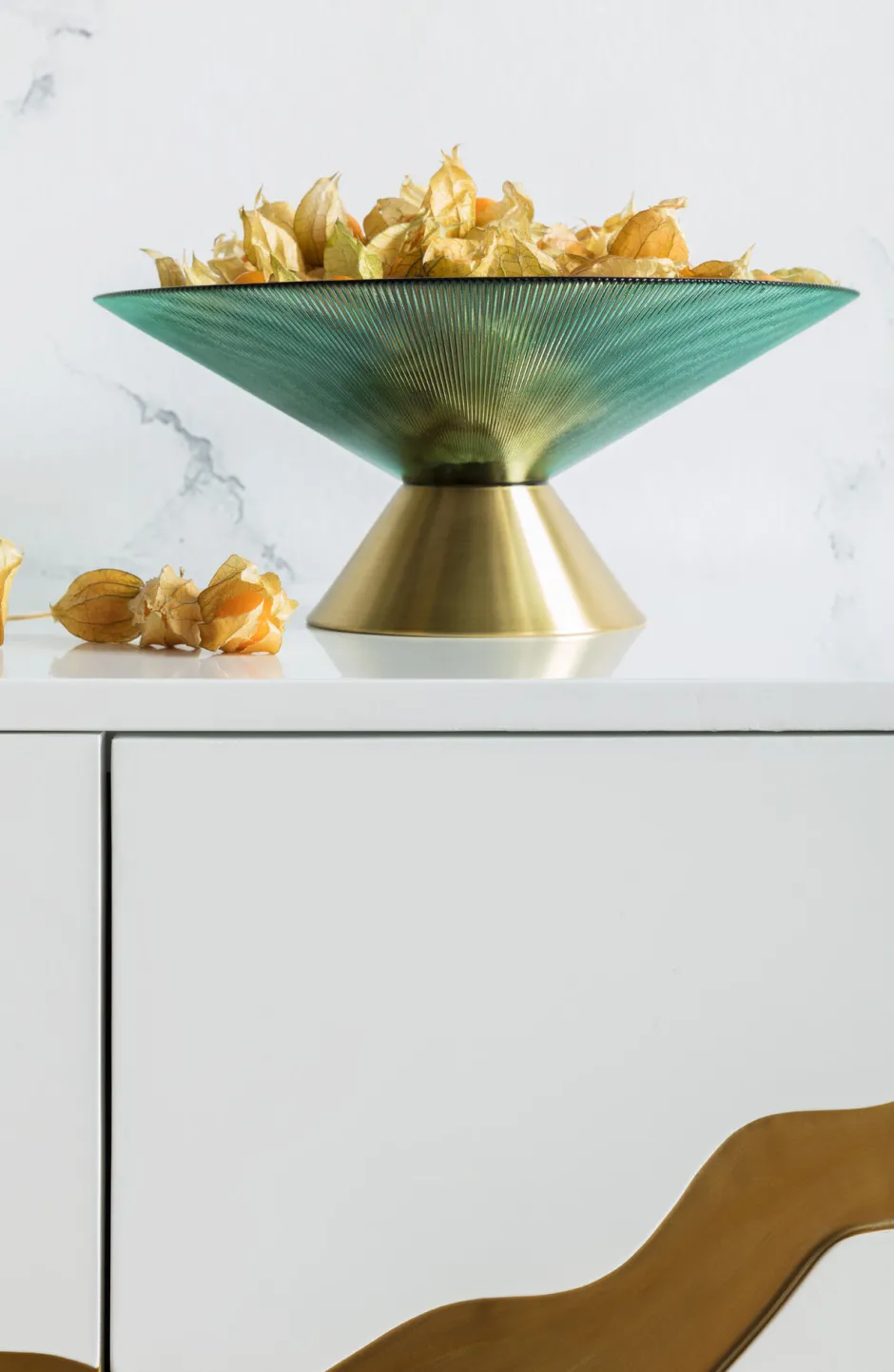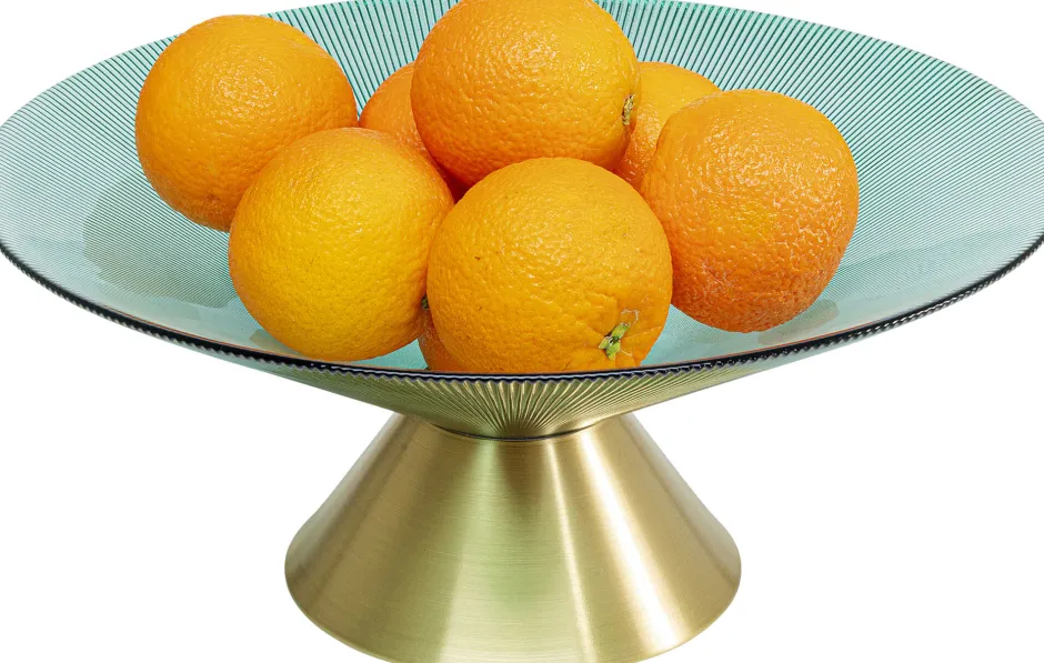 - Für extravagante Stillleben: Große Glasschale in aufregendem Blau und mit goldfarbenem Messingfuß