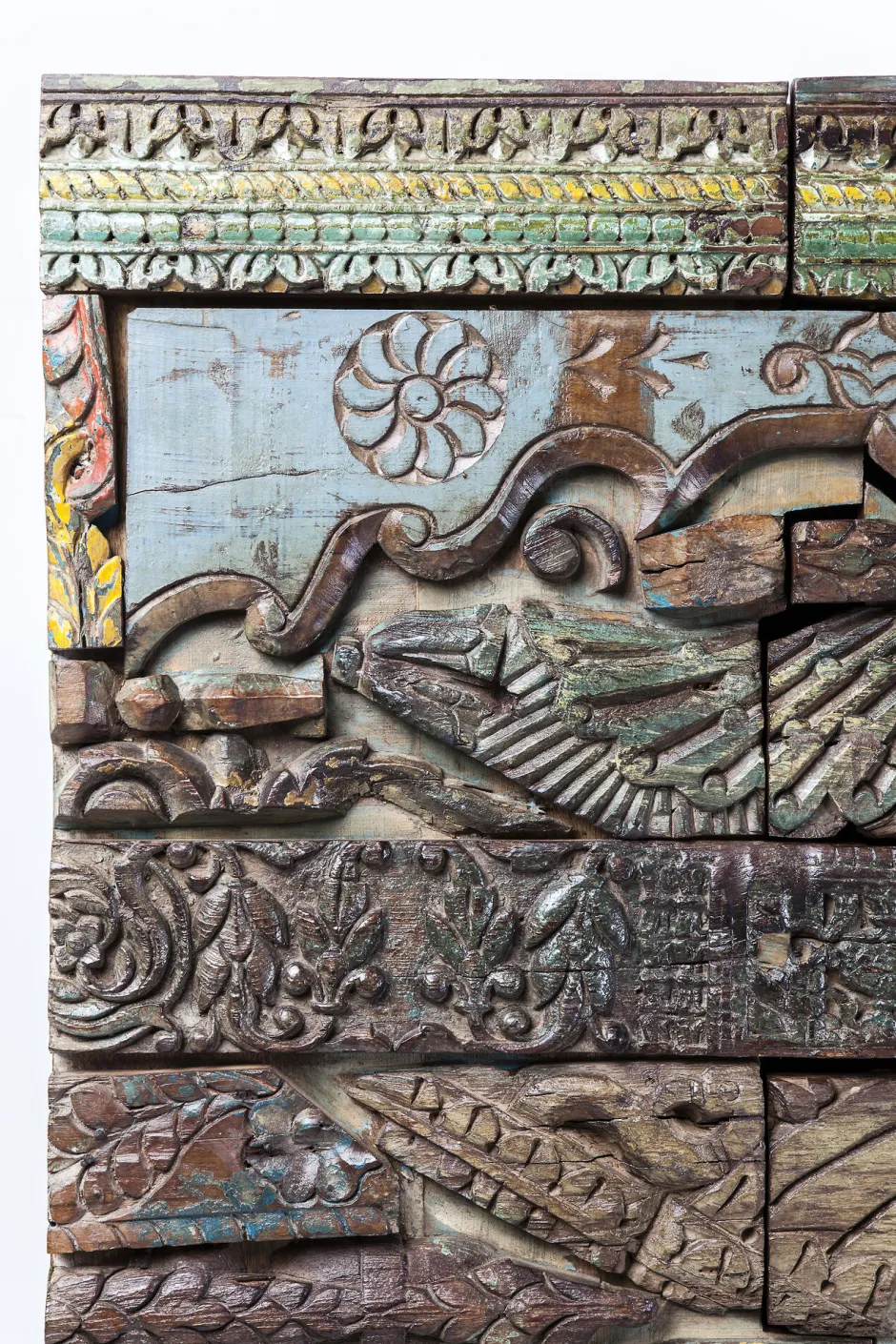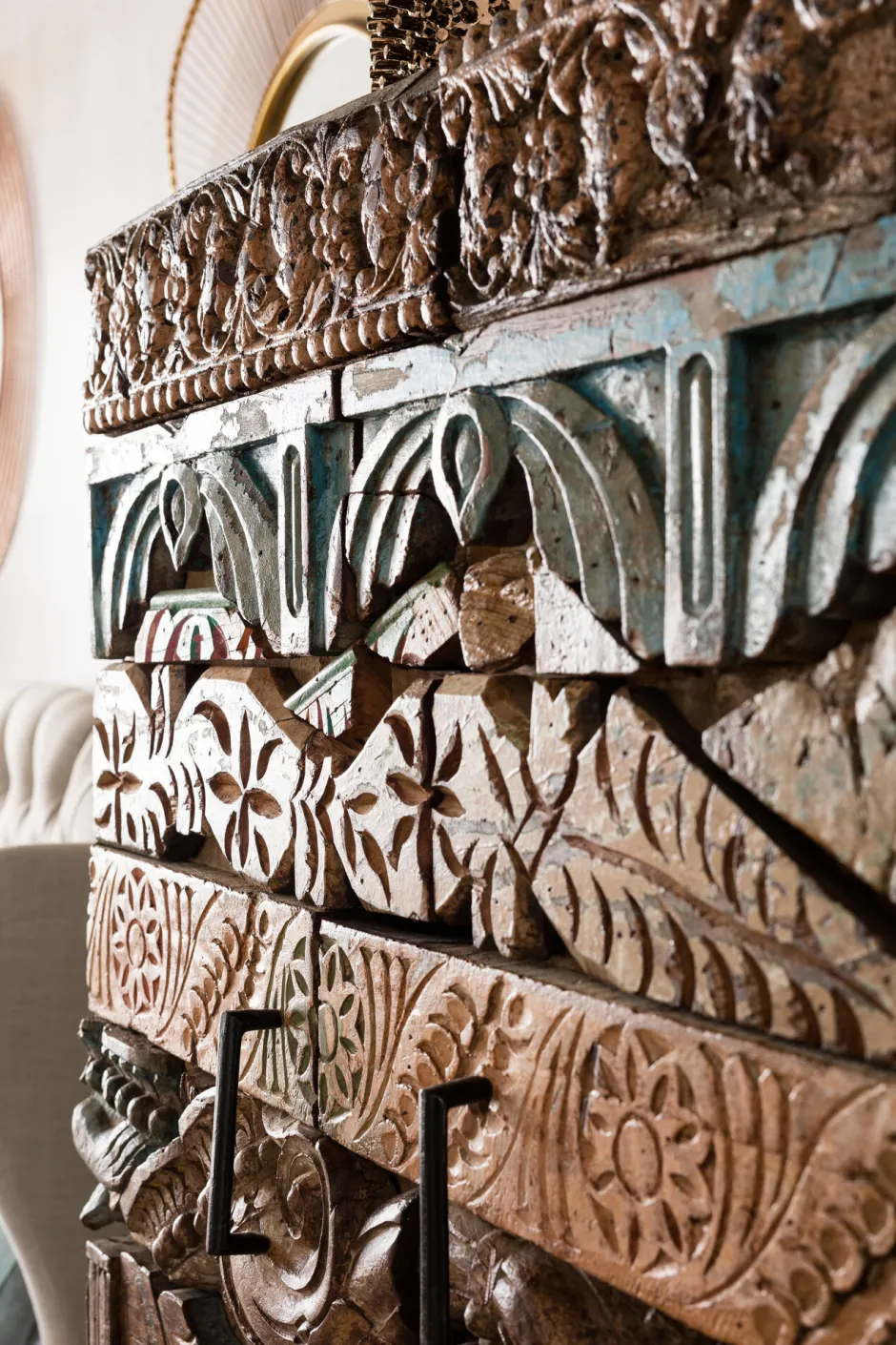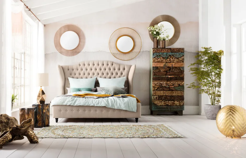 Es sind die Details, die Dinge zum Leben erwecken. Wie eine reich verzierte Wand aus phantasievoll geschnitzten Motiven und Ornamenten – so präsentiert sich dieser prachtvolle und mystisch anmutende Schrank aus der KARE Serie Shanti. Mit viel Fantasie erzählt dieser Schrank märchenhafte Geschichten, die von verborgenen Schätzen, Prophezeiungen und einer Romantik handeln, die in all ihrer Schönheit dargestellt wird. Diesen Rätseln auf der Spur lassen sich bemerkenswerte Details entdecken, wie Ornamente und florale Motive. Damit überrascht und fasziniert Shanti Surprise immer wieder und vermittelt Lebensfreude. Die Serie Shanti erzählt die Geschichte der hunderte Jahre alten Handwerkskunst des Schnitzens in Indien. Unser Design-Team hat direkt vor Ort in der Werkstatt die Idee entwickelt, wie aus Puzzle-Stücken Möbelfronten zu schaffen. Wir haben bewusst mit den rauen, ursprünglichen Formen gearbeitet, damit die Geschichte einer Handwerkskunst unverfälscht ins Heute getragen wird und der Charme und die einmalige Aura erhalten bleiben. Auch als Kommode erhältlich. Pflege: Bücherregal: Trocken abstauben. Bei Reliefoberflächen aus Holz eignet sich eine weiche Kleiderbürste, um aus den Rillen Staub zu entfernen. Mit dem weichen Bürstenaufsatz Ihres Staubsaugers gelegentlich vorsichtig absaugen. Einzigartige Handarbeit aus Naturmaterial: Es zeichnet natürliche Materialien aus, dass sie auch nach ihrer Verarbeitung weiter leben, auf Hitze, Feuchtigkeit oder starkes Sonnenlicht reagieren können. Diese Lebensspuren sind gewollt und Bestandteil eines authentischen Möbels.Material: (Mango Massivholz gewachst)