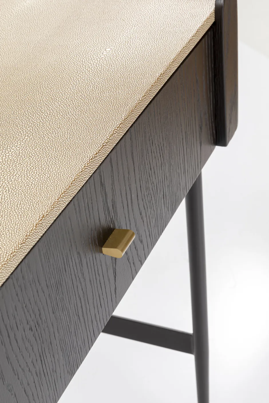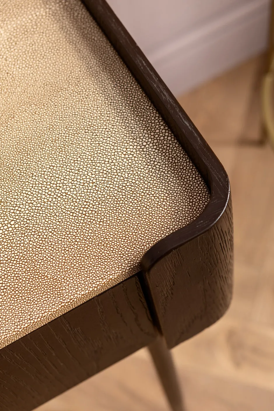 - Charaktervoll: die Kombination von dunklem, schwarz-braunem Eichenholz-Furnier mit den cremefarbenen Bezügen in feiner Rochenhaut-Optik