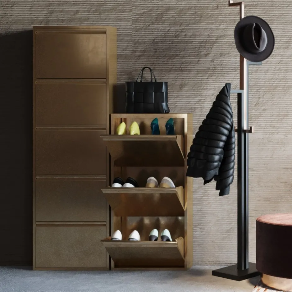 - Mittelhoher Schuhschrank in modernem Stahldesign mit drei Kippfächern für mindestens 6 Paar Schuhe, je nach Modell und Größe