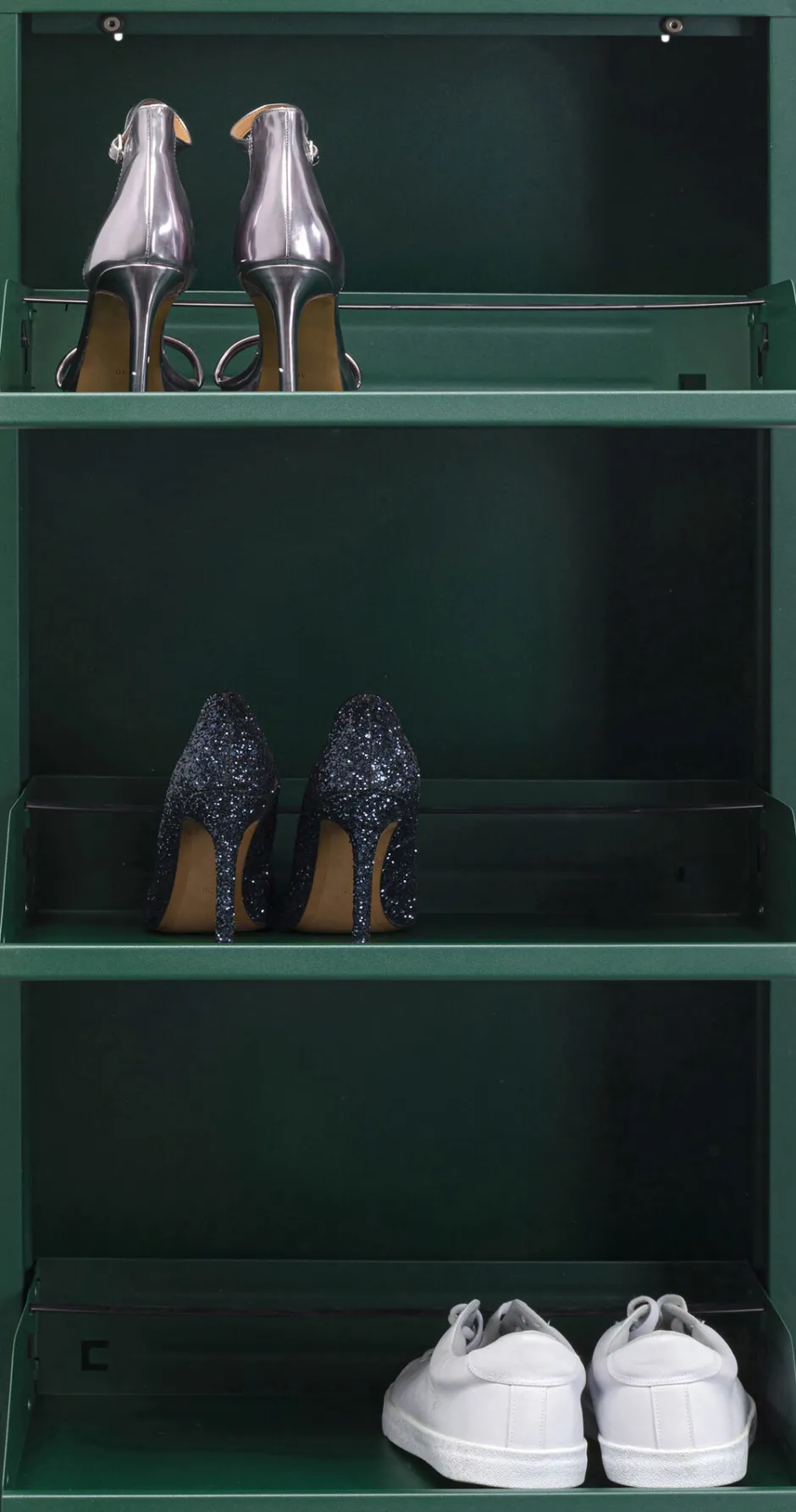 - Mit drei Kippfächern, die Schuhe vor Staub und Blicken schützen