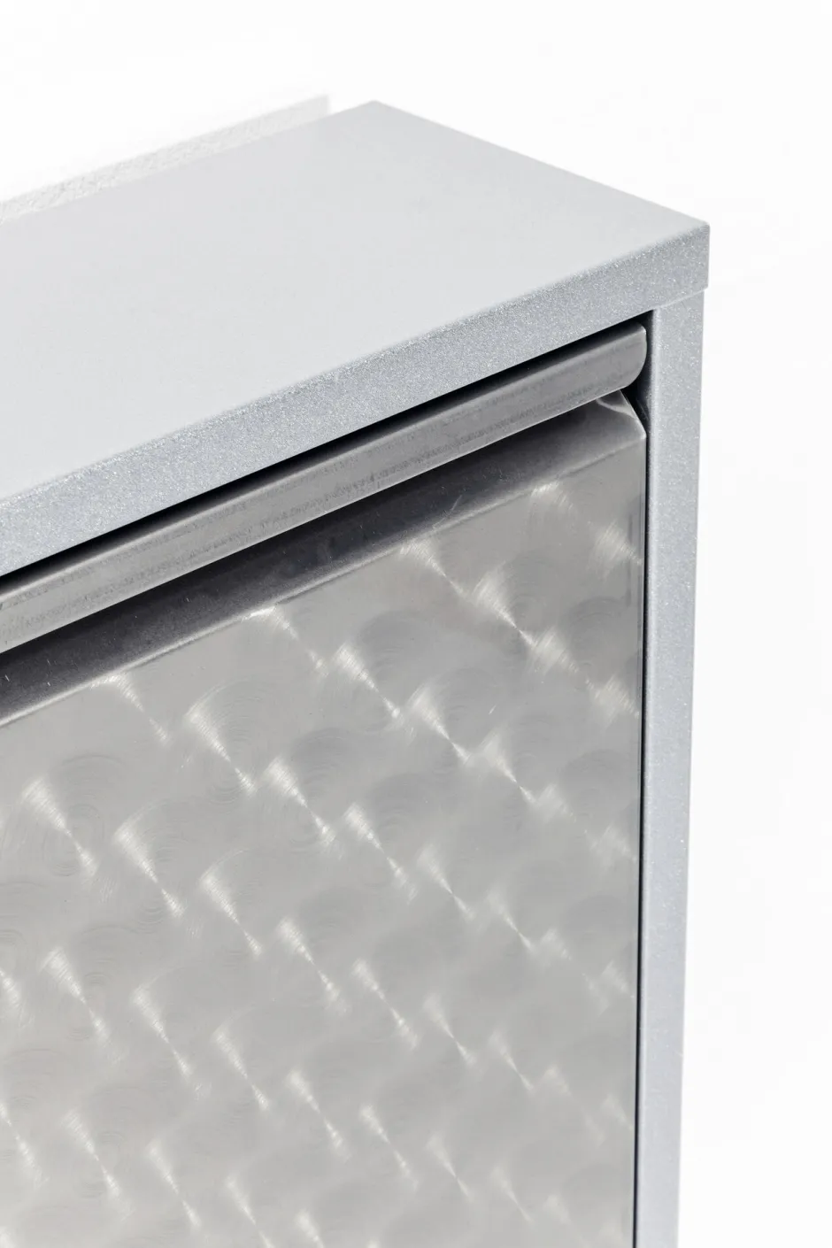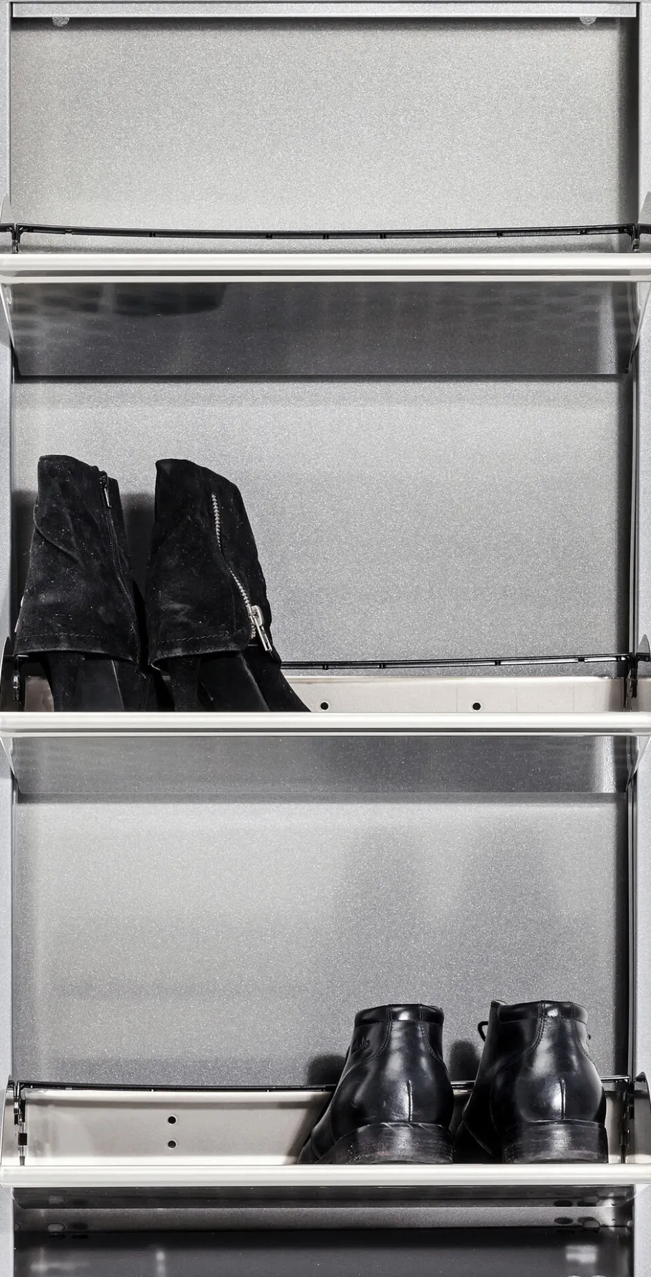 - Mittelhoher Schuhschrank aus silberglänzendem geflexten Stahlblech für ca. sechs Paar Schuhe