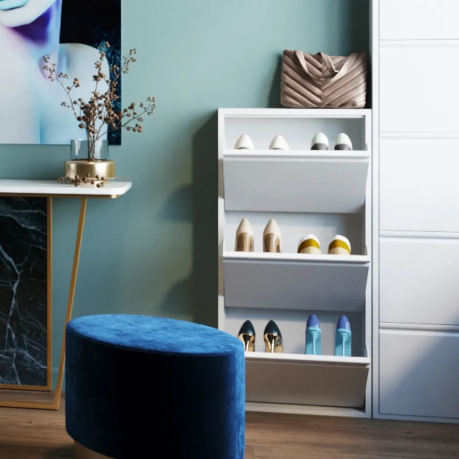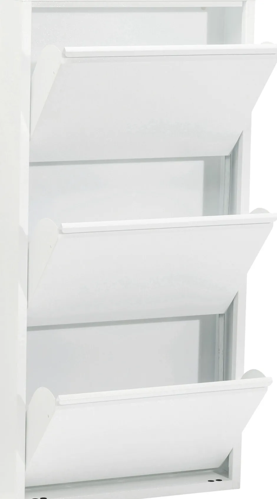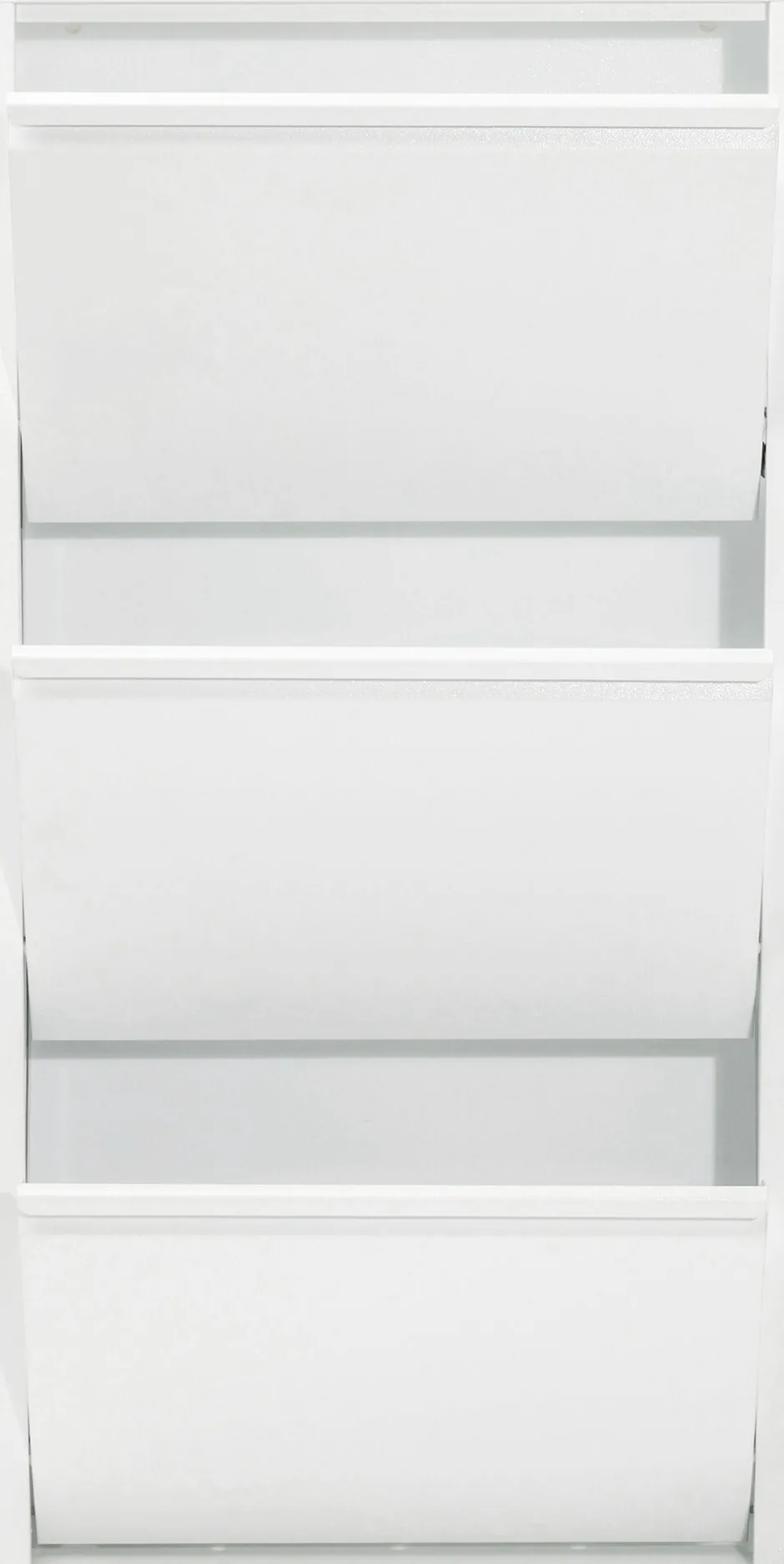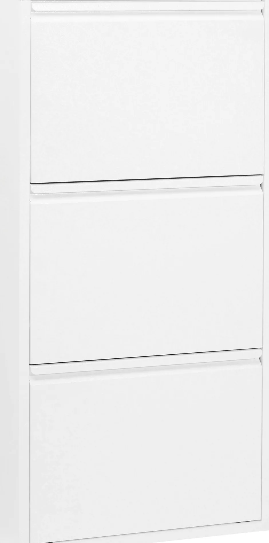 - Weißer Schuhschrank in modernem Stahldesign mit drei Kippfächern für mindestens 6 Paar Schuhe, je nach Modell und Größe