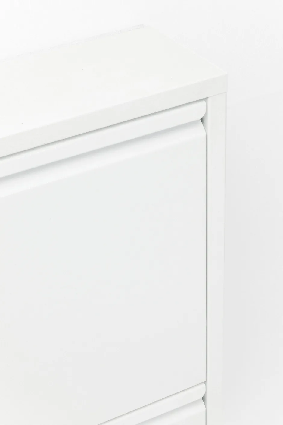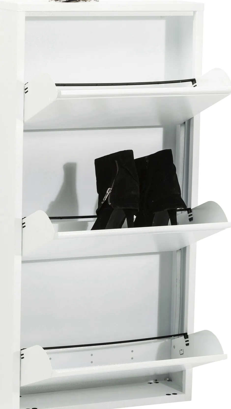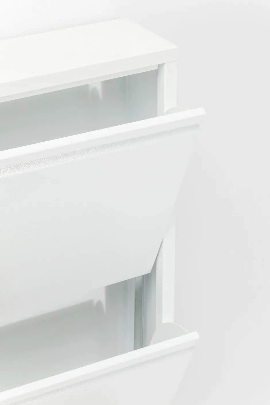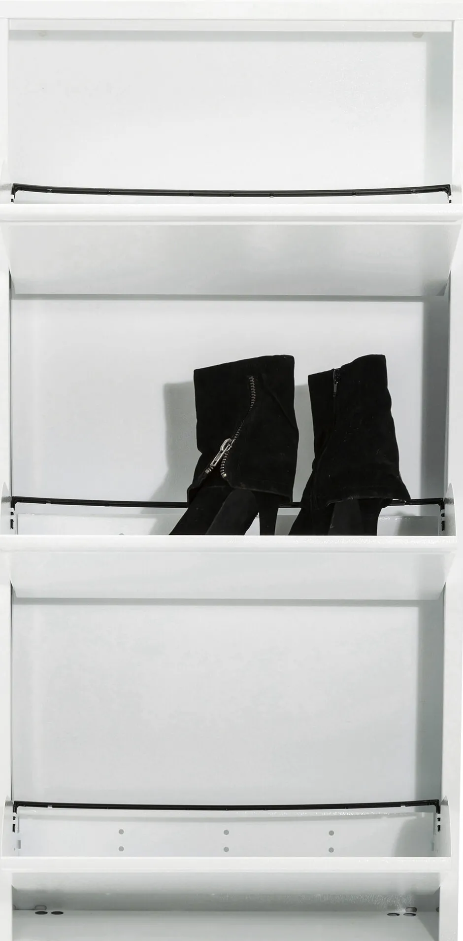 - Weißer Schuhschrank in modernem Stahldesign mit drei Kippfächern für mindestens 6 Paar Schuhe, je nach Modell und Größe