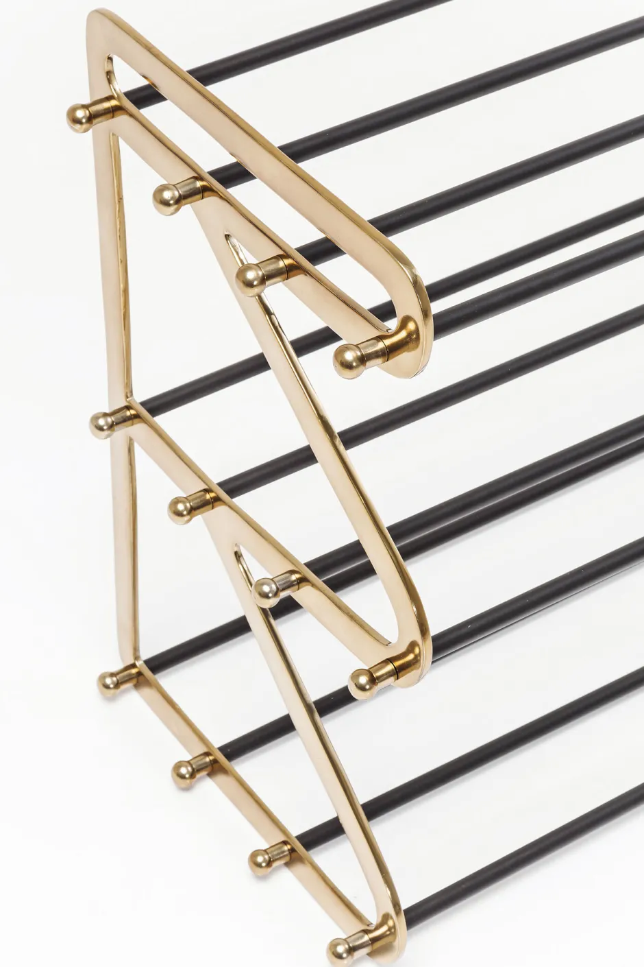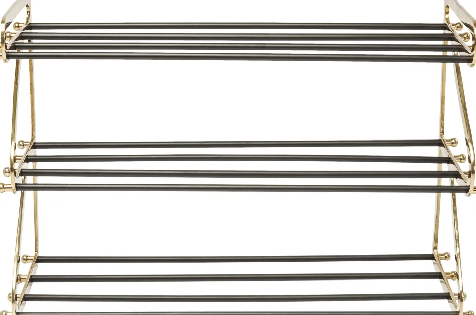 - Schuhregal aus Stahl mit Glam-Faktor, lackiert in Schwarz und Gold und mit hübschen Zierelementen