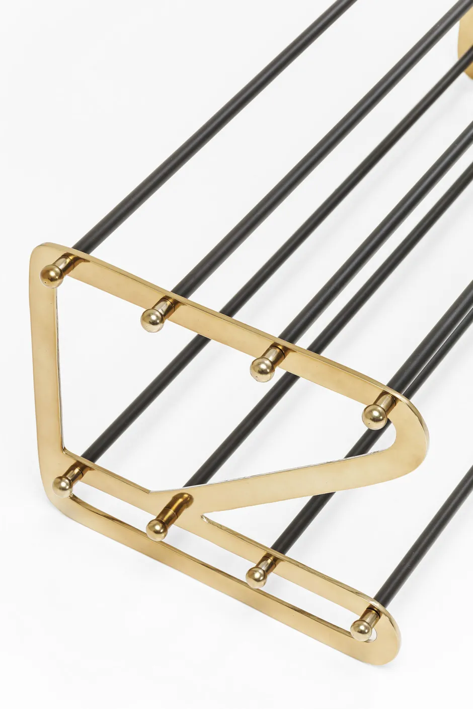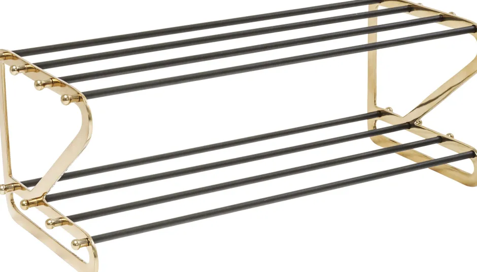- Schuhregal aus Stahl mit Glam-Faktor, lackiert in Schwarz und Gold und mit hübschen Zierelementen