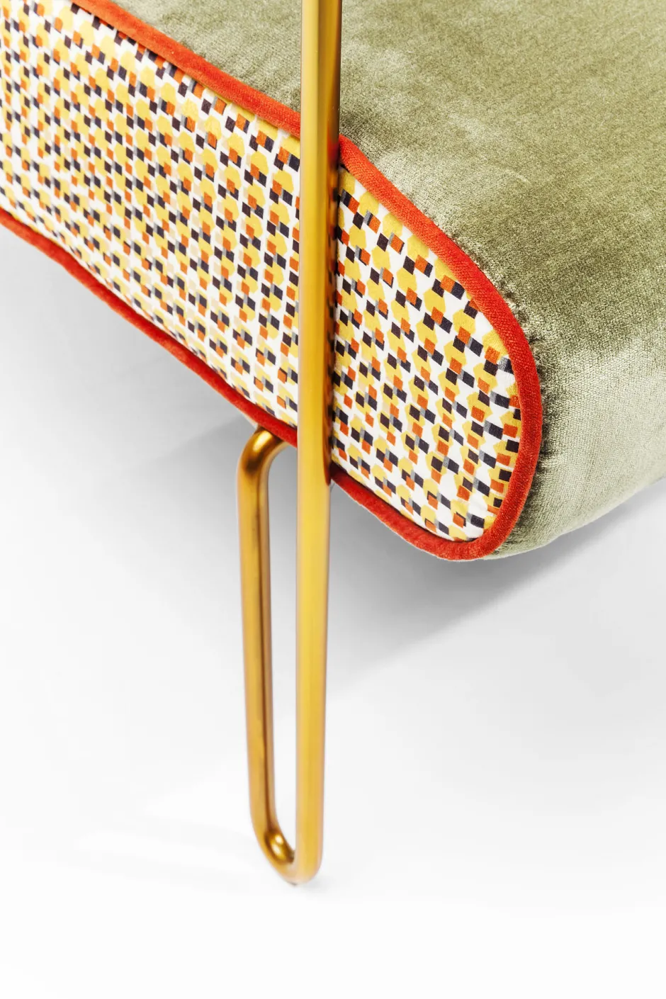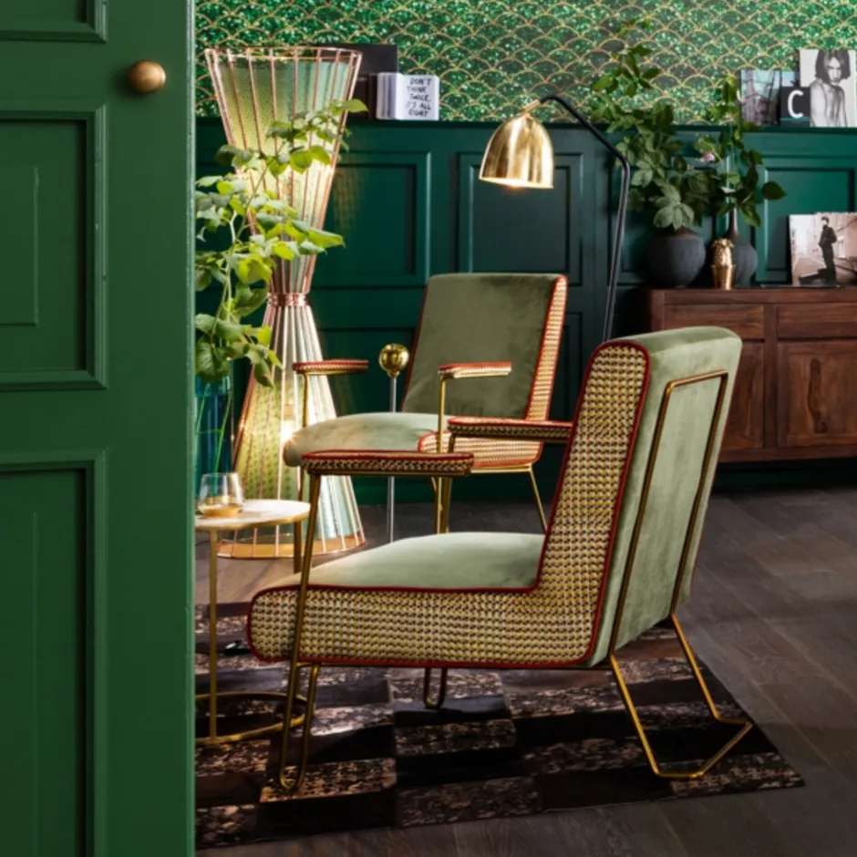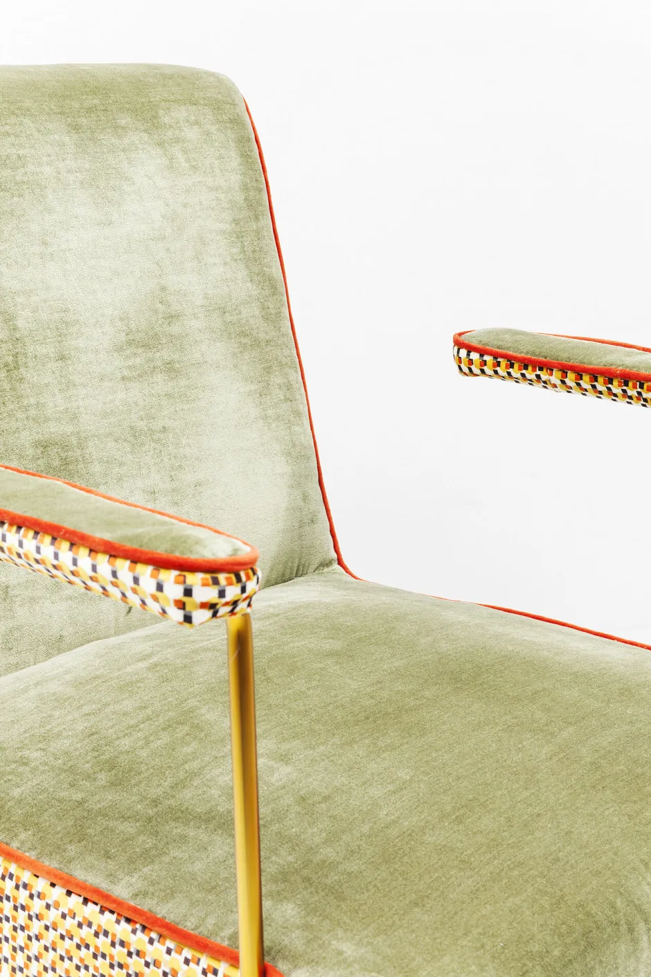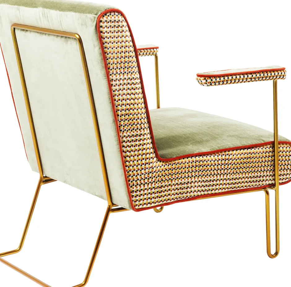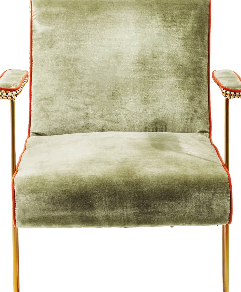 - Grüner Samt-Sessel im 50ies-Look mit dekorativen, farbigen Seiten-Details, filigranen Armstützen und Beinen aus Stahl in der Farbe Messing