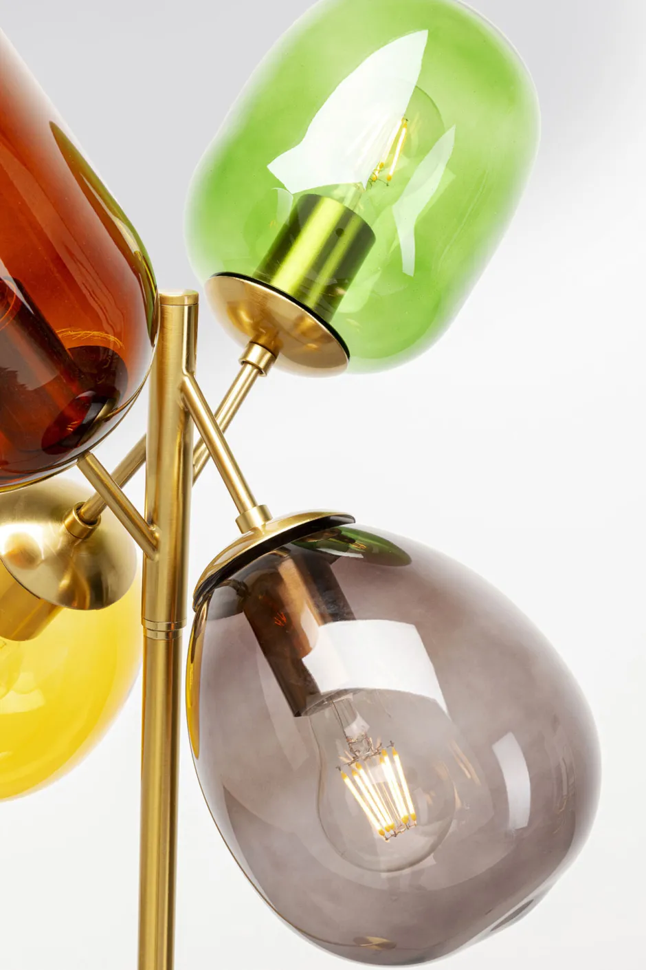 - Die Glasschirme in semitransparentem Braun, Grau, Grün und Gelb schimmern zart dank der Galvanisierung