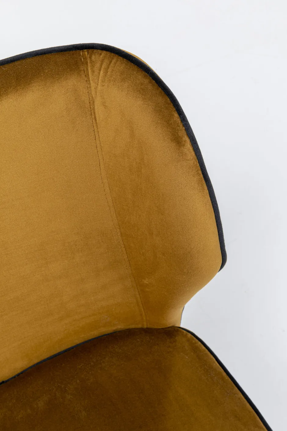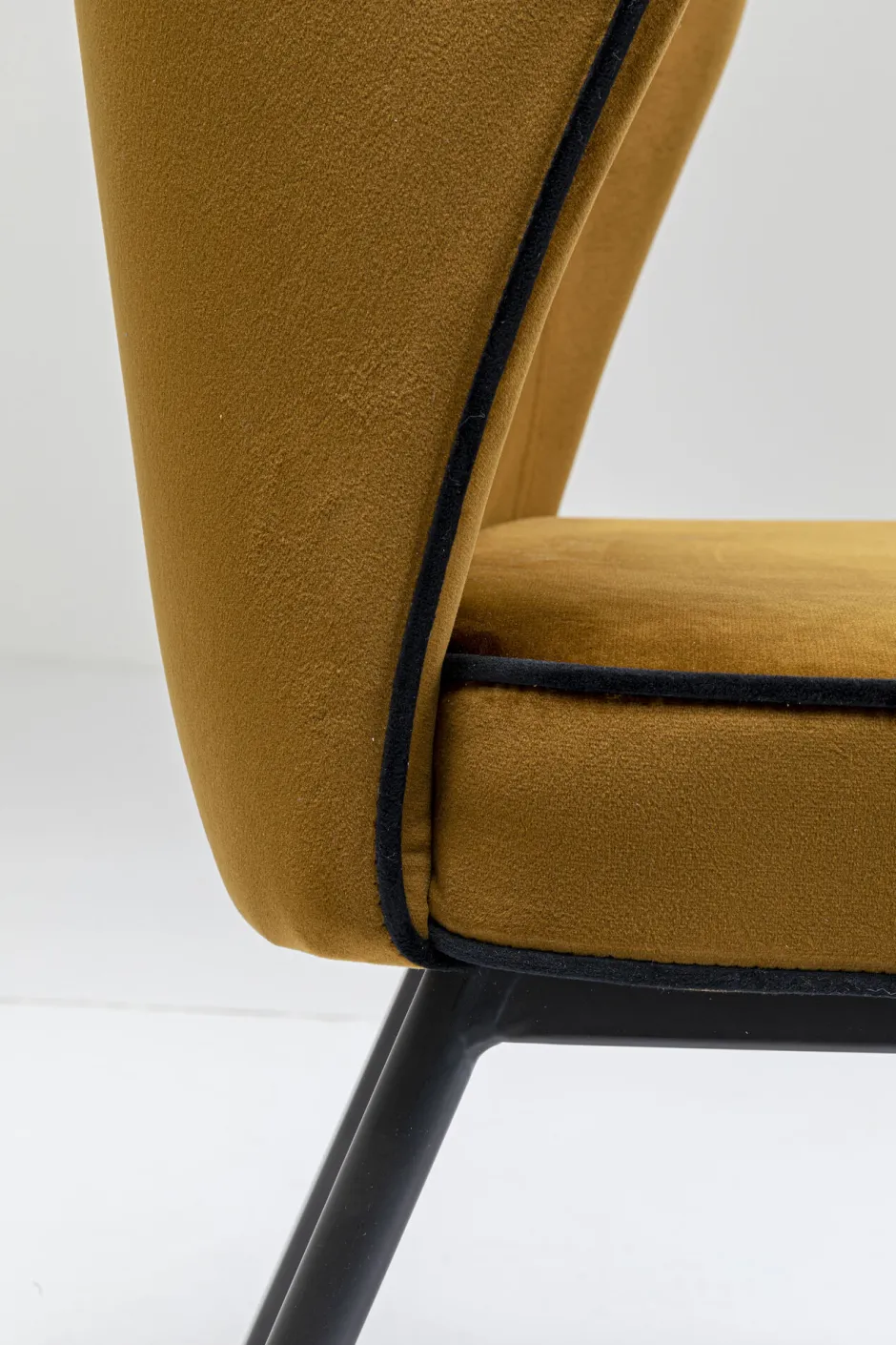 - Gepolsterter Stuhl mit Curry gelbem Bezug in samtiger Optik, schwarzen Ziernähten und lackierten Stahlbeinen