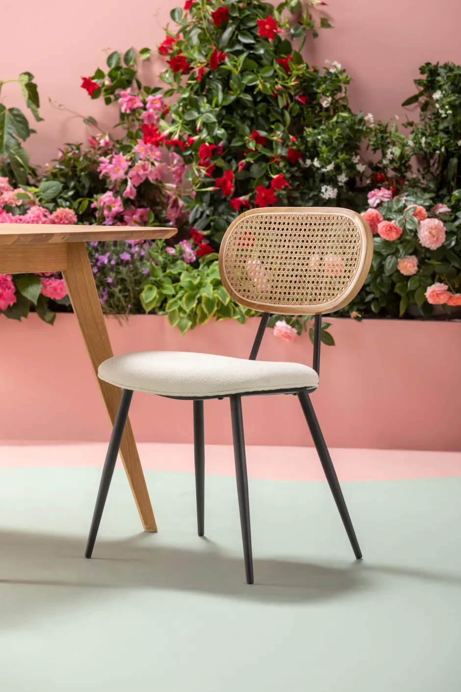- Kreatives Retro-Design mit einer Kombination aus Holz, Geflecht und Bouclé-Polster