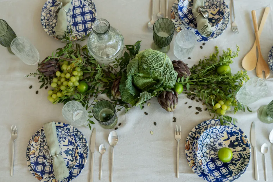 - Mixen Sie einfach den gemusterten Teller mit farblich passendem Geschirr