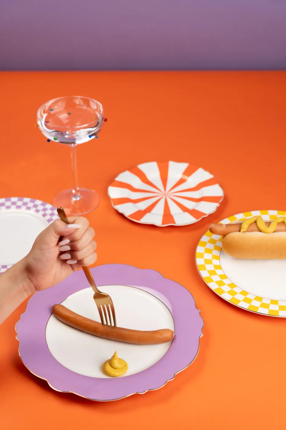 - Begeistert auf jedem Esstisch durch seine klassische Form und den Rand in zartem Lila
