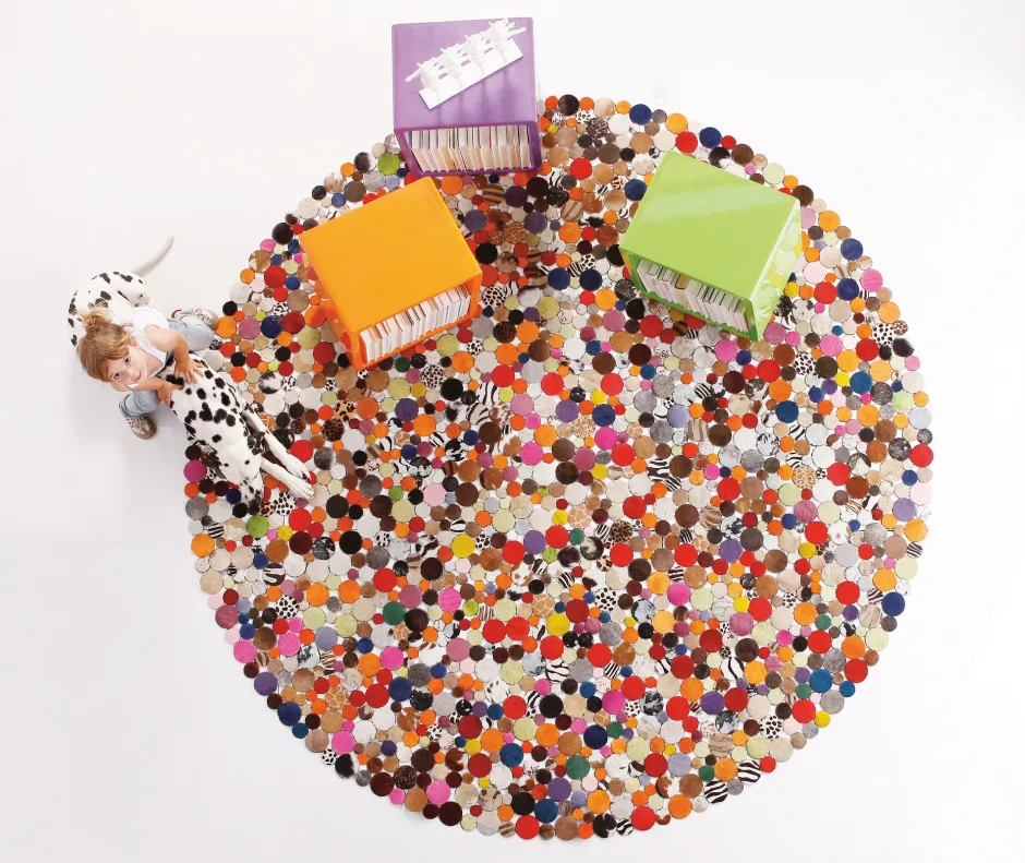 Teppich Circle Multi Ø250cm KARE – Spaß am Wohnen! Bunt gemustertes Rund aus FellDieser ausladende Teppich aus kleinen…
