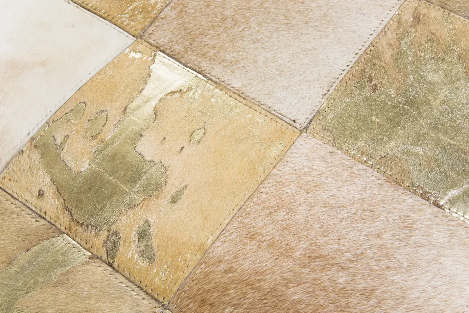 - Ein Teppich, der das Kuhdesign im Patchwork-Stil neu interpretiert und mit goldenen Akzenten veredelt