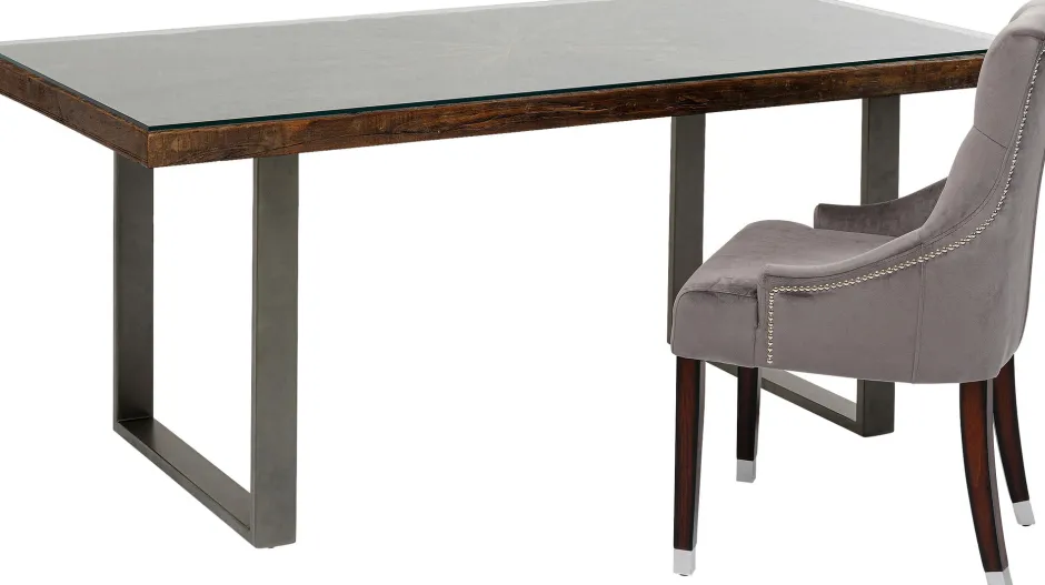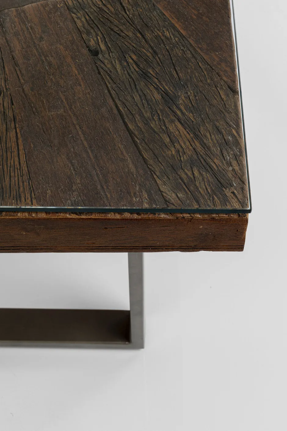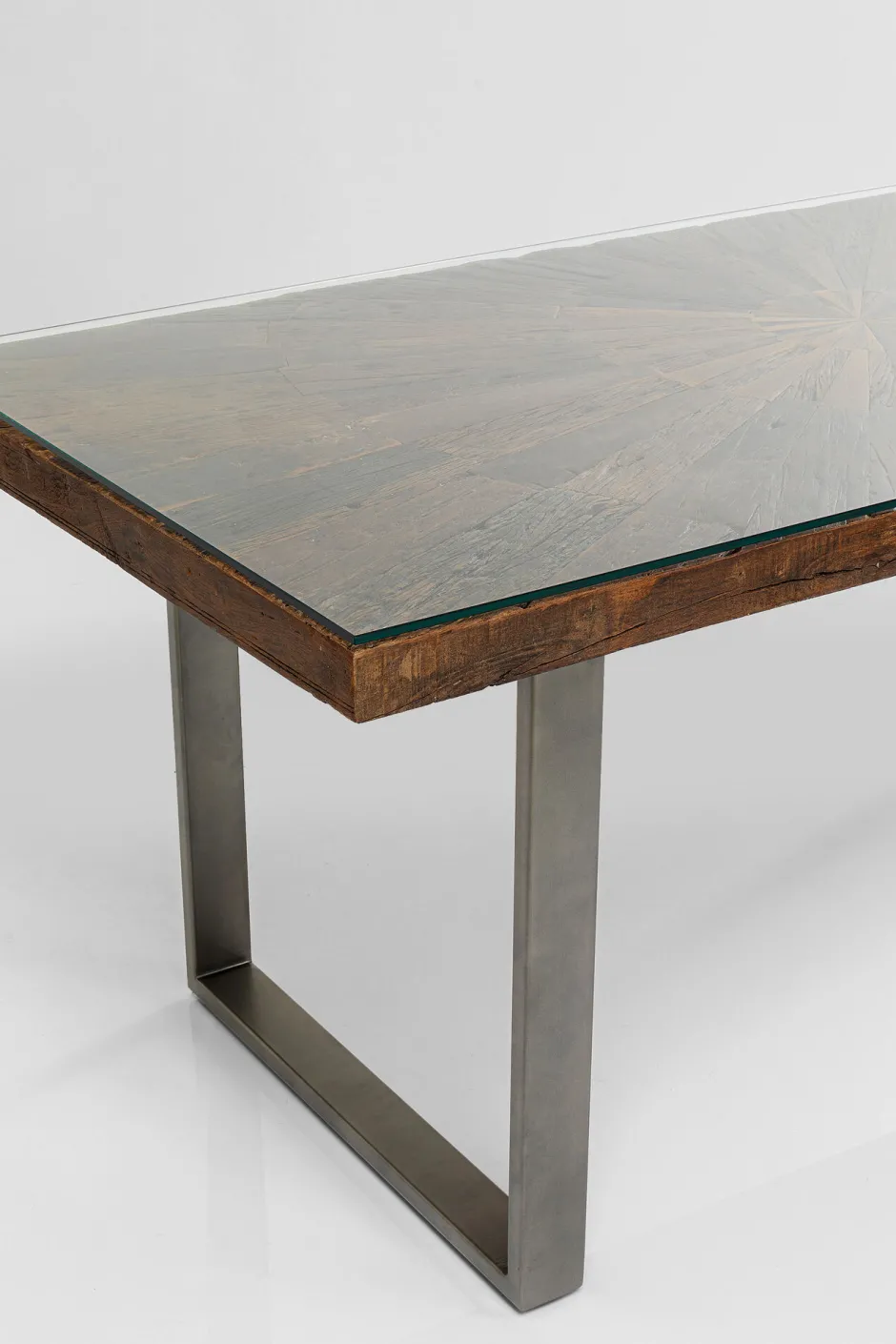 - Rechteckiger, dunkler Esstisch aus recyceltem Massivholz mit Glasplatte und Kufen in der Farbe Rohstahl