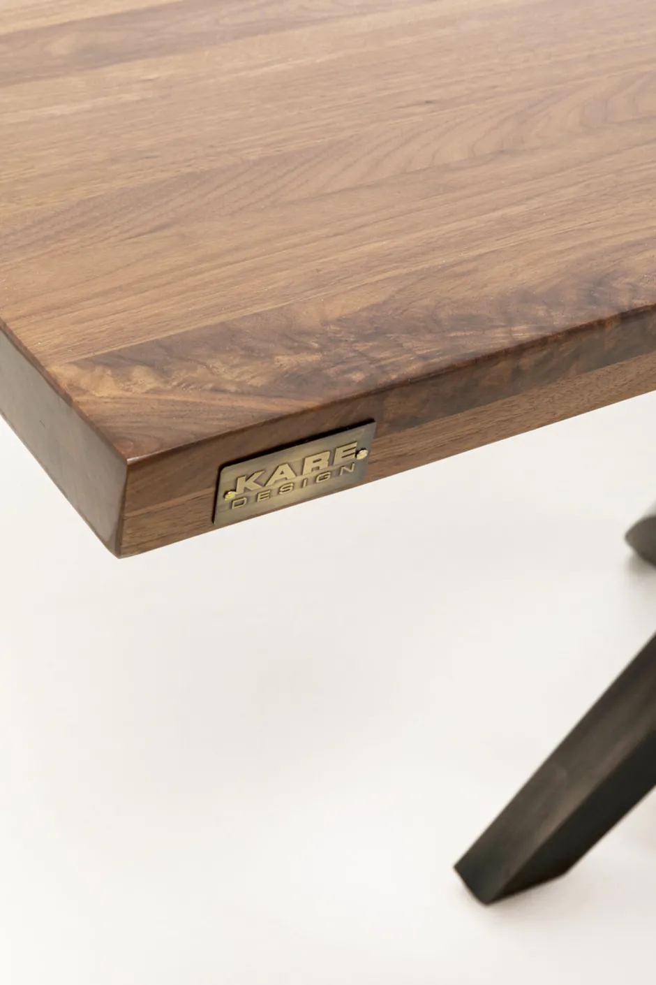 - Rechteckiger Esstisch mit einer massiven Platte aus lackiertem Nussbaum Holz und einem kunstvollen Tischgestell aus Stahl