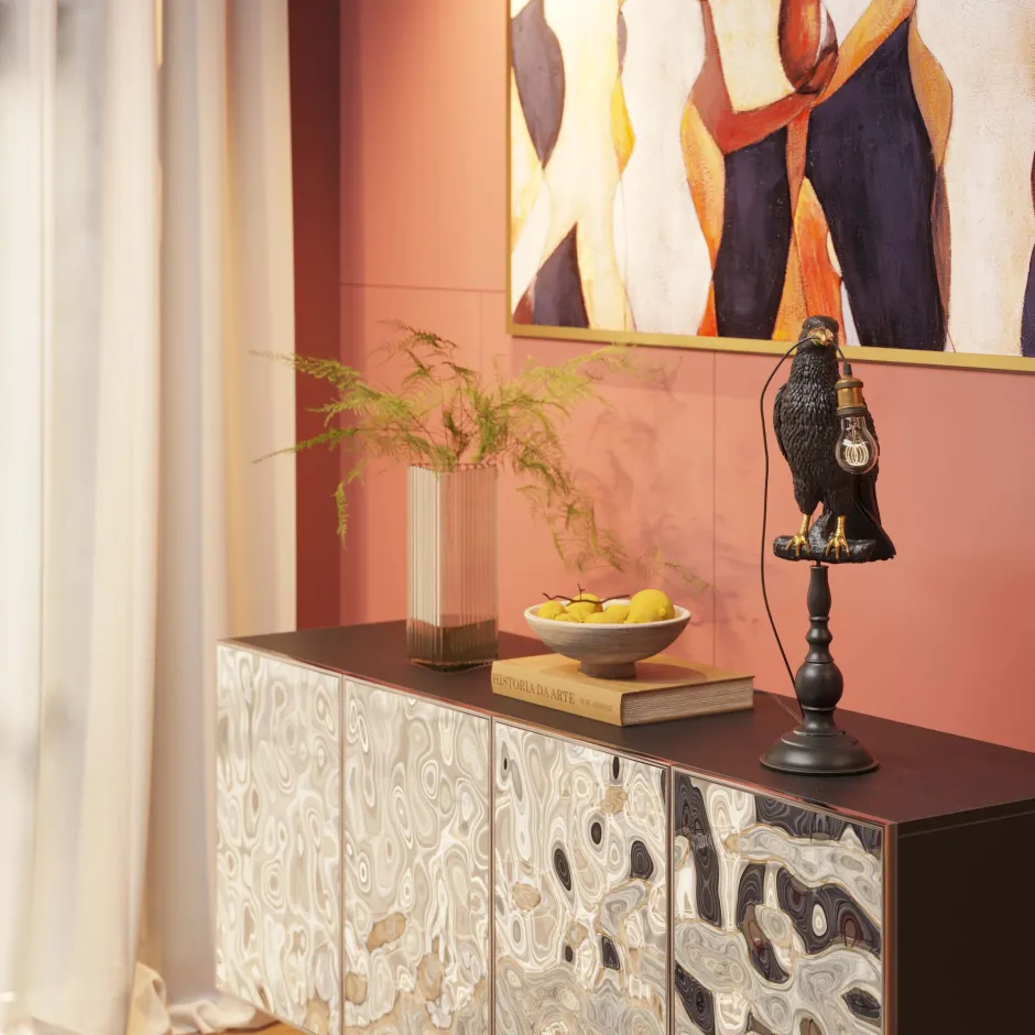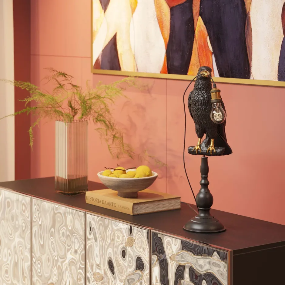 - Schwarze Tischleuchte auf Säule mit goldfarbenen Akzenten. Als Kabelträger für die Lichtinstallation kommt ein Rabe ins Spiel
