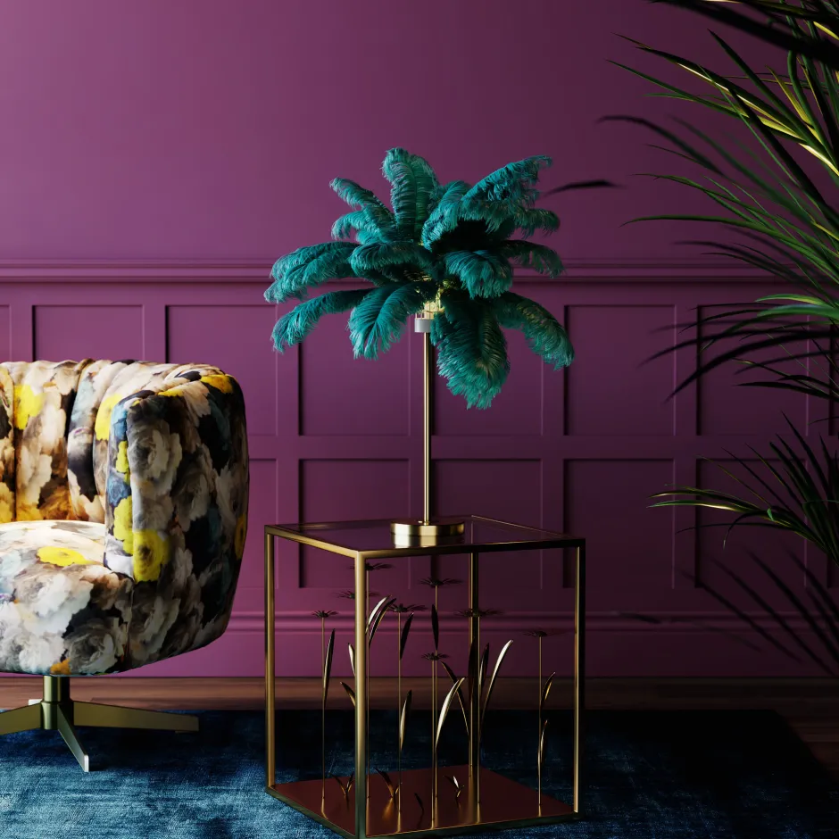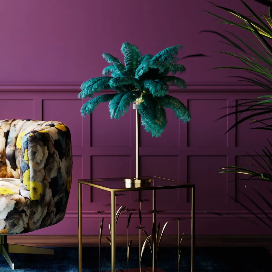 - Goldene Tischleuchte mit grünen Straußenfedern, 60x50x50cm (H/B/T)