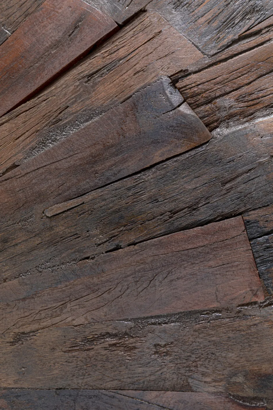 - Das Recyclingholz mit seinen sichtbaren Lebensspuren wird in Kreis- und Strahlenform zu einem wunderschönen Muster zusammengefügt. Magic!