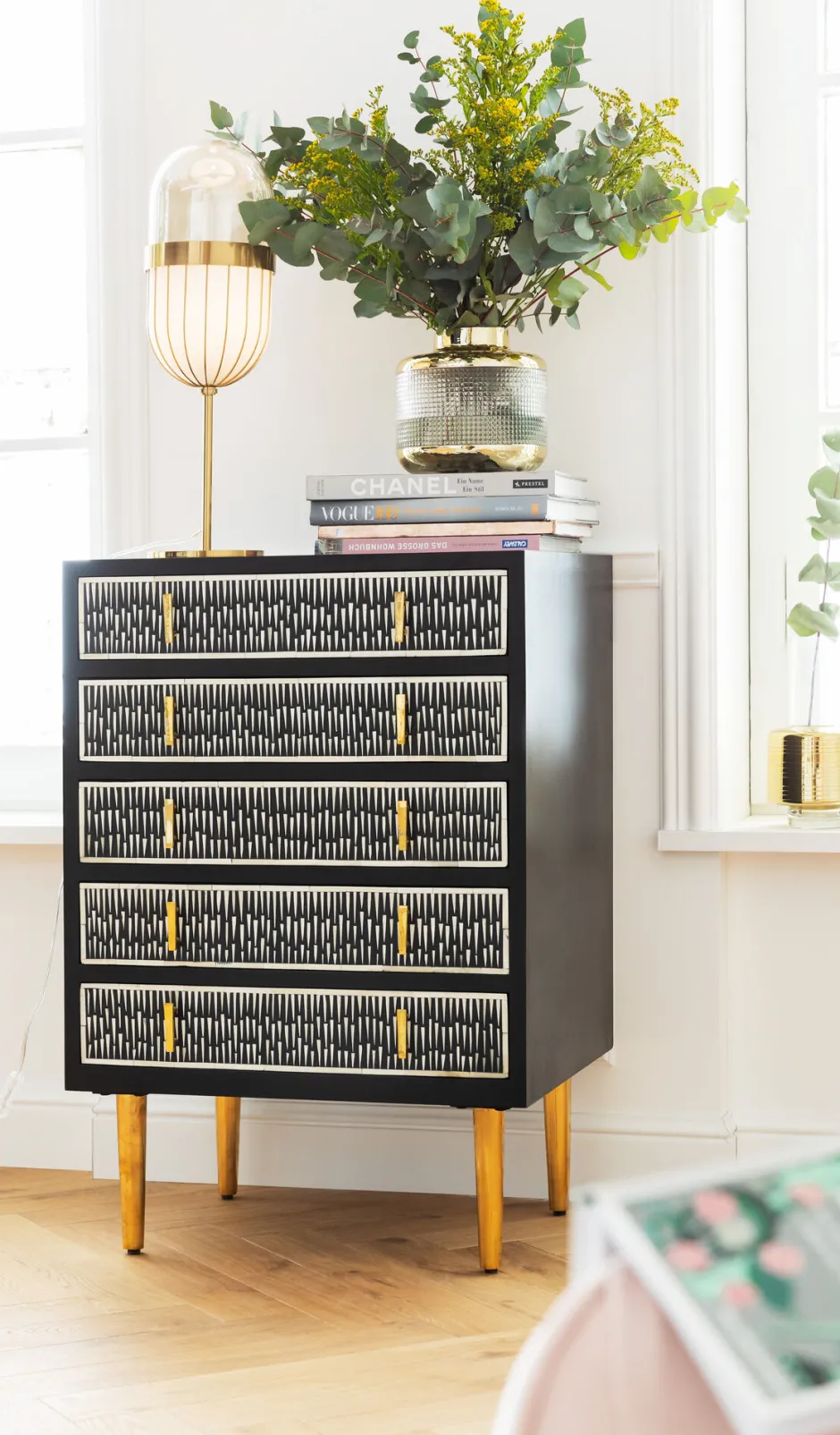 - Die geradlinige grafische Prägung des Glases bekommt mit den glänzenden Goldakzenten ein glamouröses Upgrade