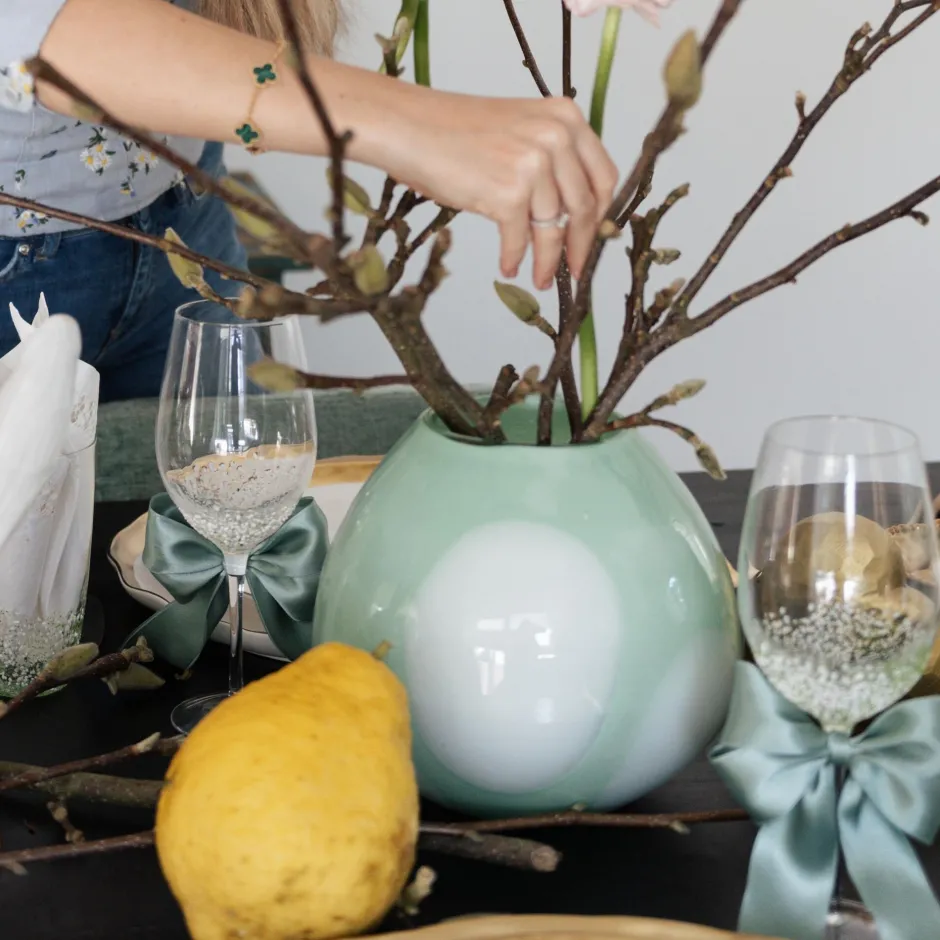 - In einem erfrischenden Pastellgrün mit weißen Akzenten und dank der abgerundeten Form setzt die Vase stilvolle Akzente