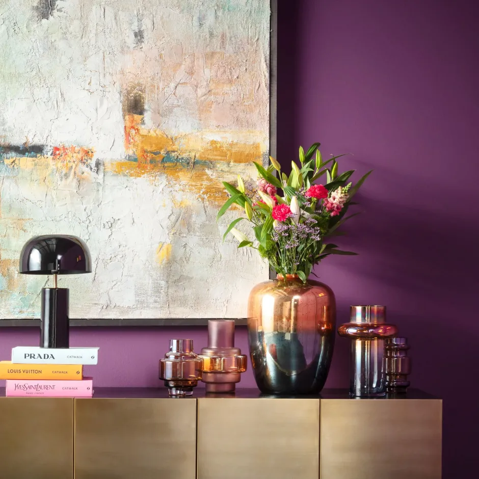 - Extravagante Glasvase in der Trend-Farbe Aubergine mit Akzenten in Gelb-Gold