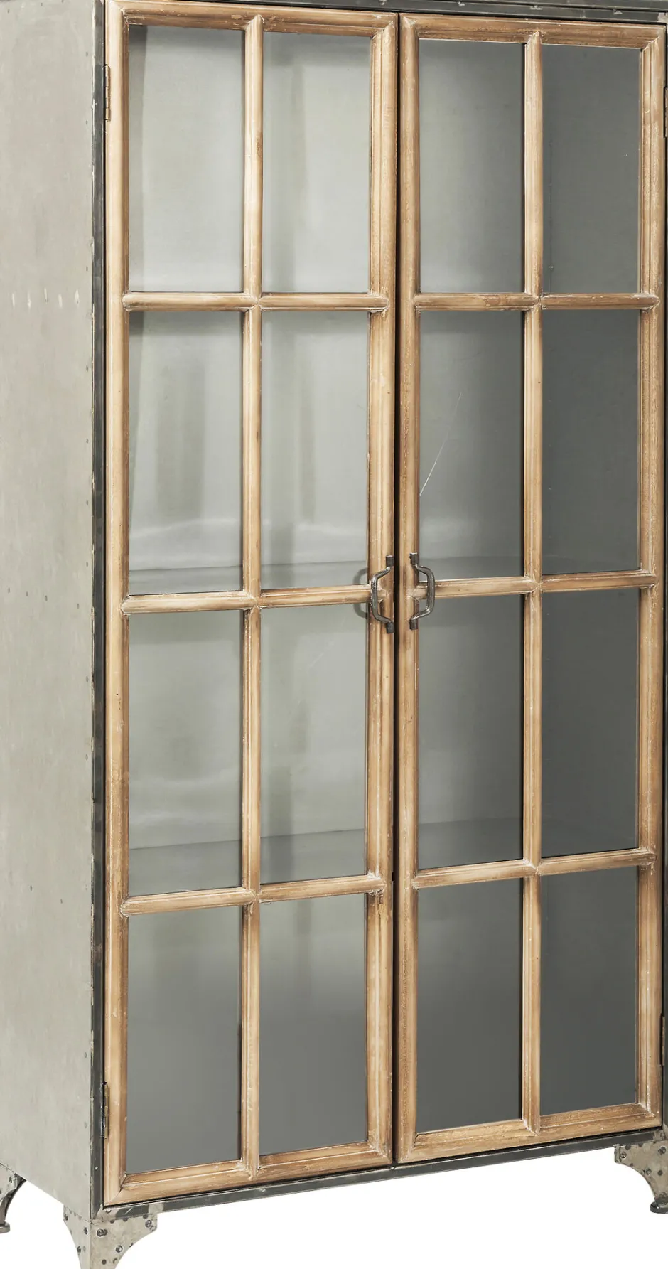 - Im Industrial-Stil: hohe Vitrine mit Korpus aus lackiertem, anthrazitfarbenem Stahl, Türrahmen aus Massivholz und Glastüren