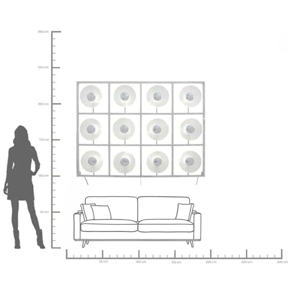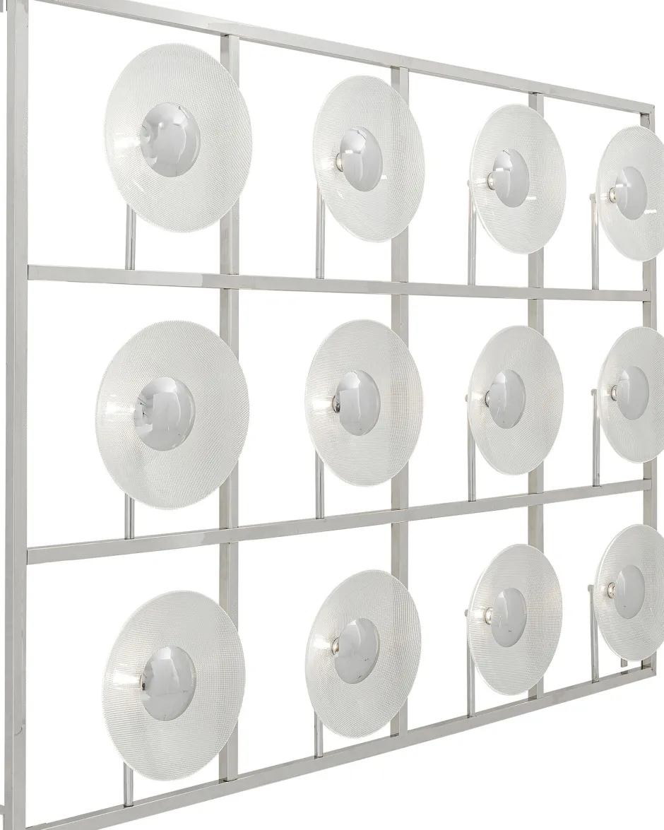 - Großes Leuchtobjekt für die Hängung an der Wand mit glänzend verchromtem Rahmen aus Edelstahl und 12 Leuchtenschirmen